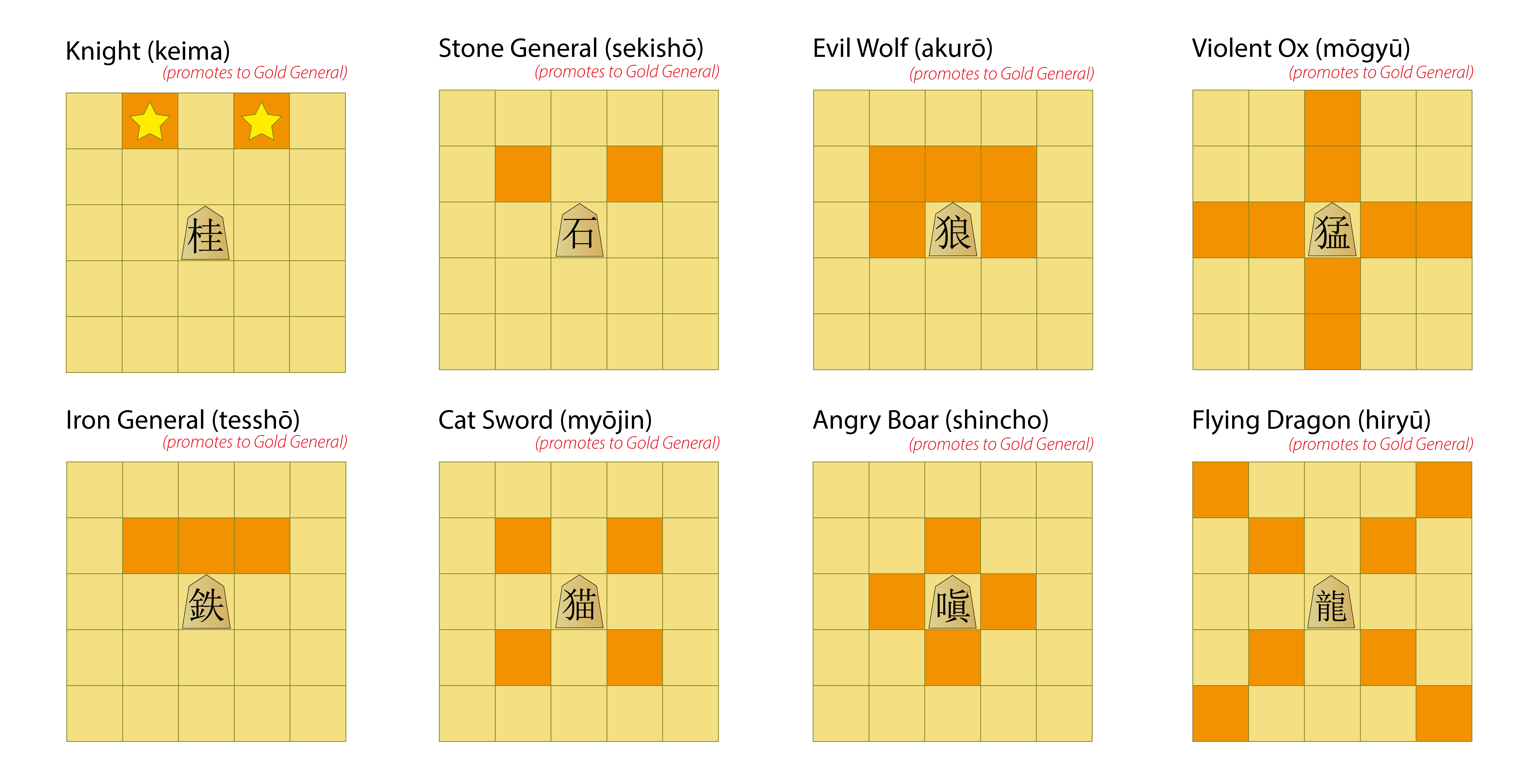 • Non-upward-compatible pieces: Knight, Cat Sword, Violent Ox, Flying Dragon