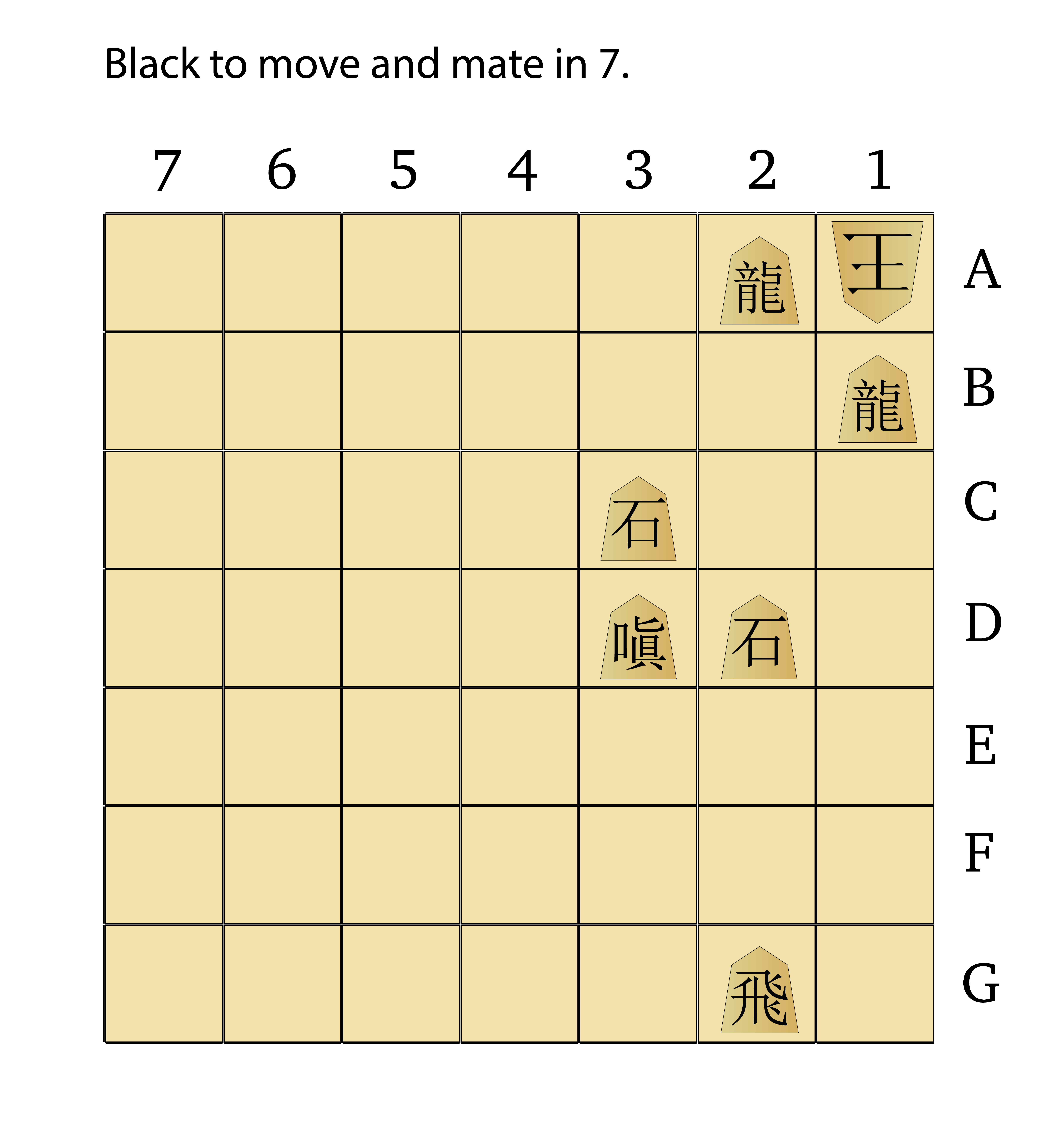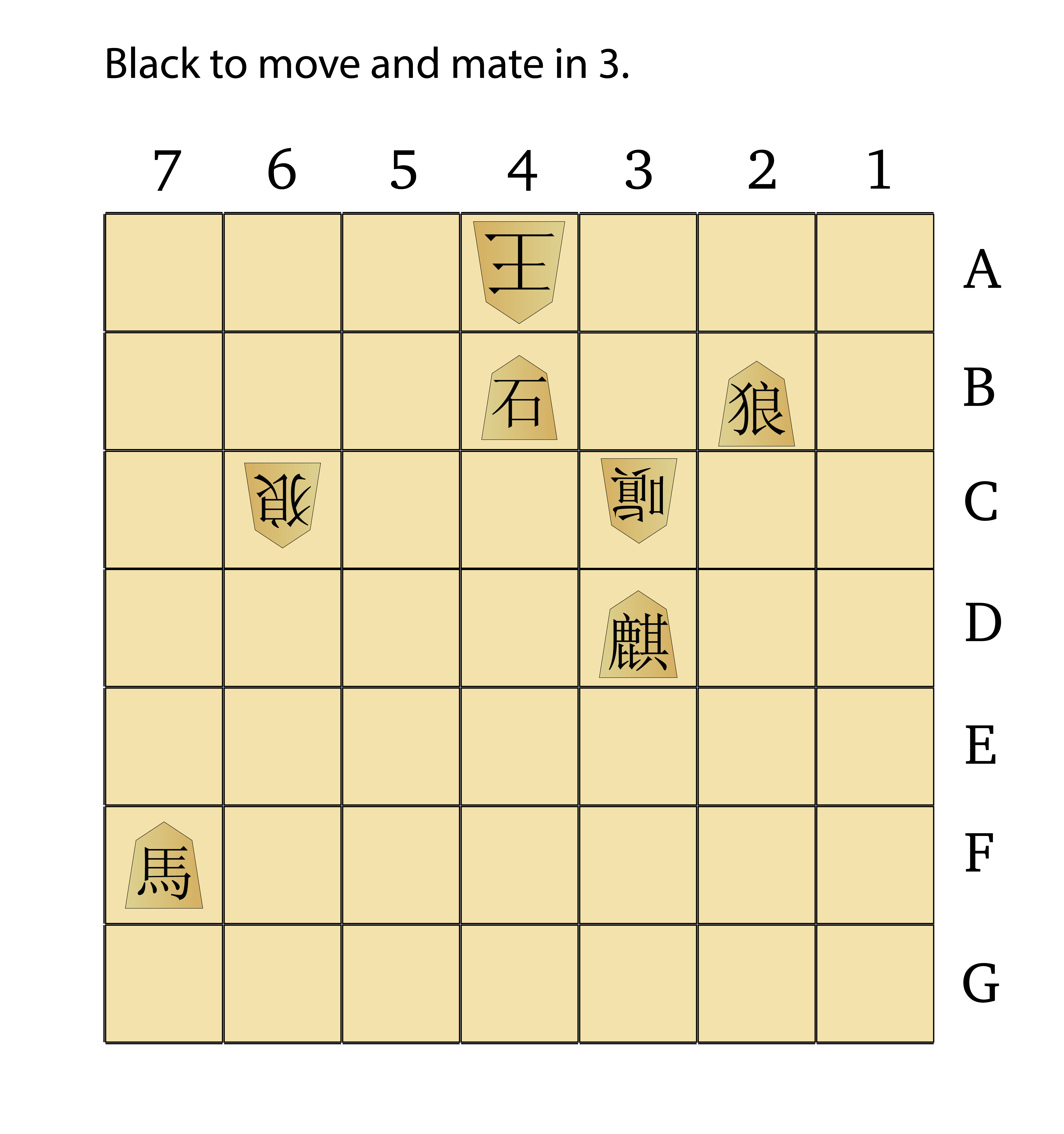 Puzzle 3 is a bit more of a challenge; there are a number of blind alleys one can wander down before discovering the most forcing line.  The solution makes clever use of the Stone Generals to pull the King out of the corner and restrict his escape squares.  The final mate is a deadly combination of Dragon King and Stone General.
