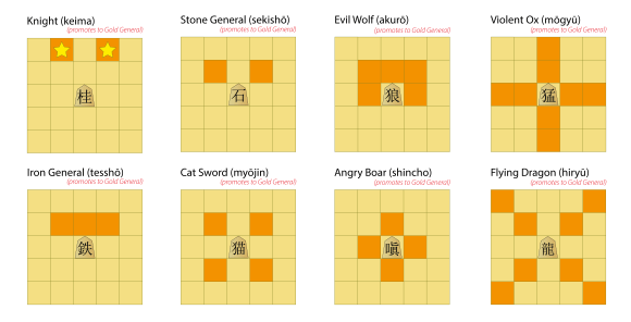 Diagram 6: The eight new pieces of Dai Shogi (1-kanji pieces)