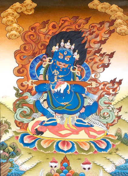 “Hey what’s up? Don’t mind me, I’m just a Dharma protector wearing a crown of skulls and a belt of human heads, standing on a fresh corpse, surrounded by an aura of flames. You know, just hangin’ out.”