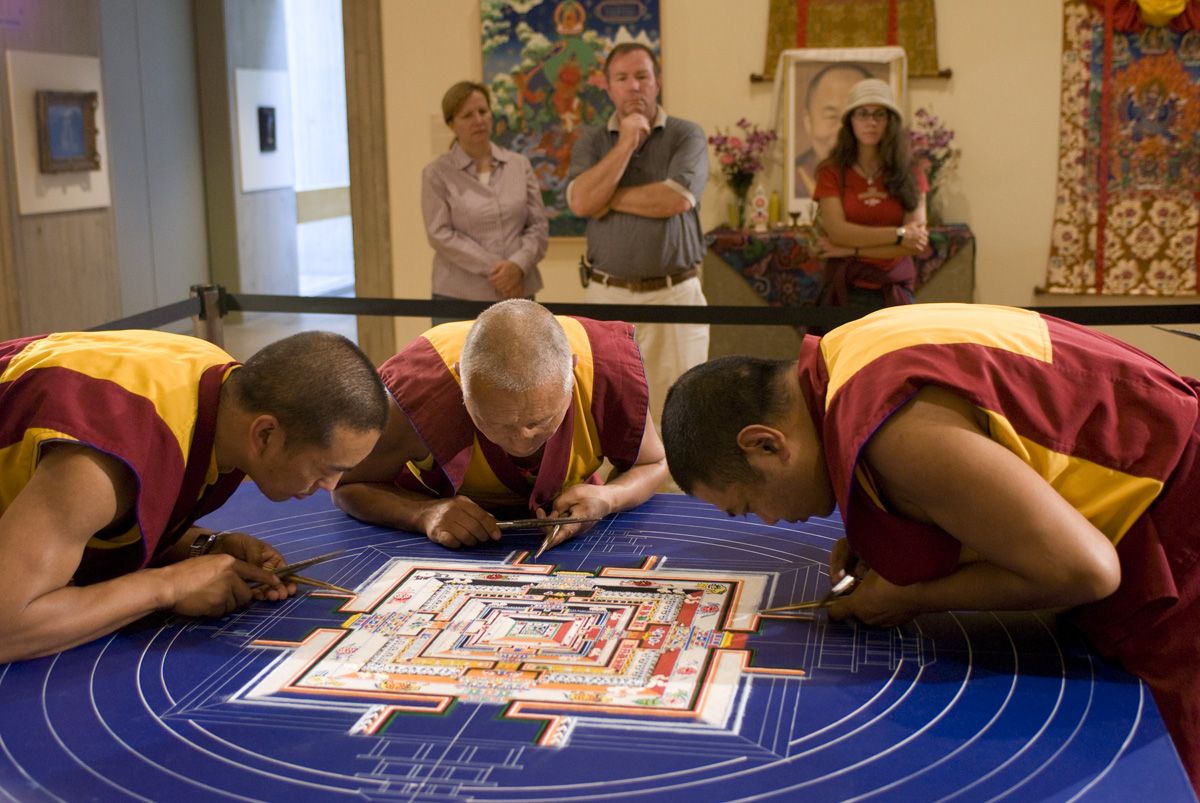 Monks painstakingly constructing a Kalachakra sand mandala. Once the many days of work are finished, the mandala is quickly destroyed, a helpful reminder to onlookers of the impermanence of all things.