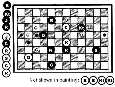 A reconstruction of the position in van Leyden’s painting. Black has surrounded White’s King and is moving in for the kill!