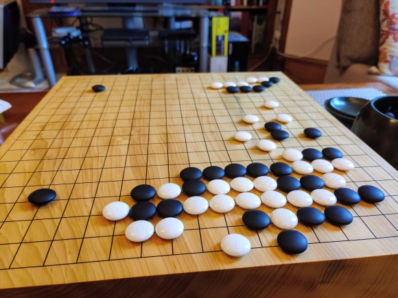 The pride of my gaming collection — a Go board made from Japanese Kaya, with the lines drawn via a sword dipped in black laquer (yes, really). The stones are the traditional slate and clamshell.