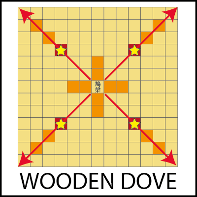 The Wooden Dove may leap three squares diagonally, then slide an additional 1 or 2 squares forward