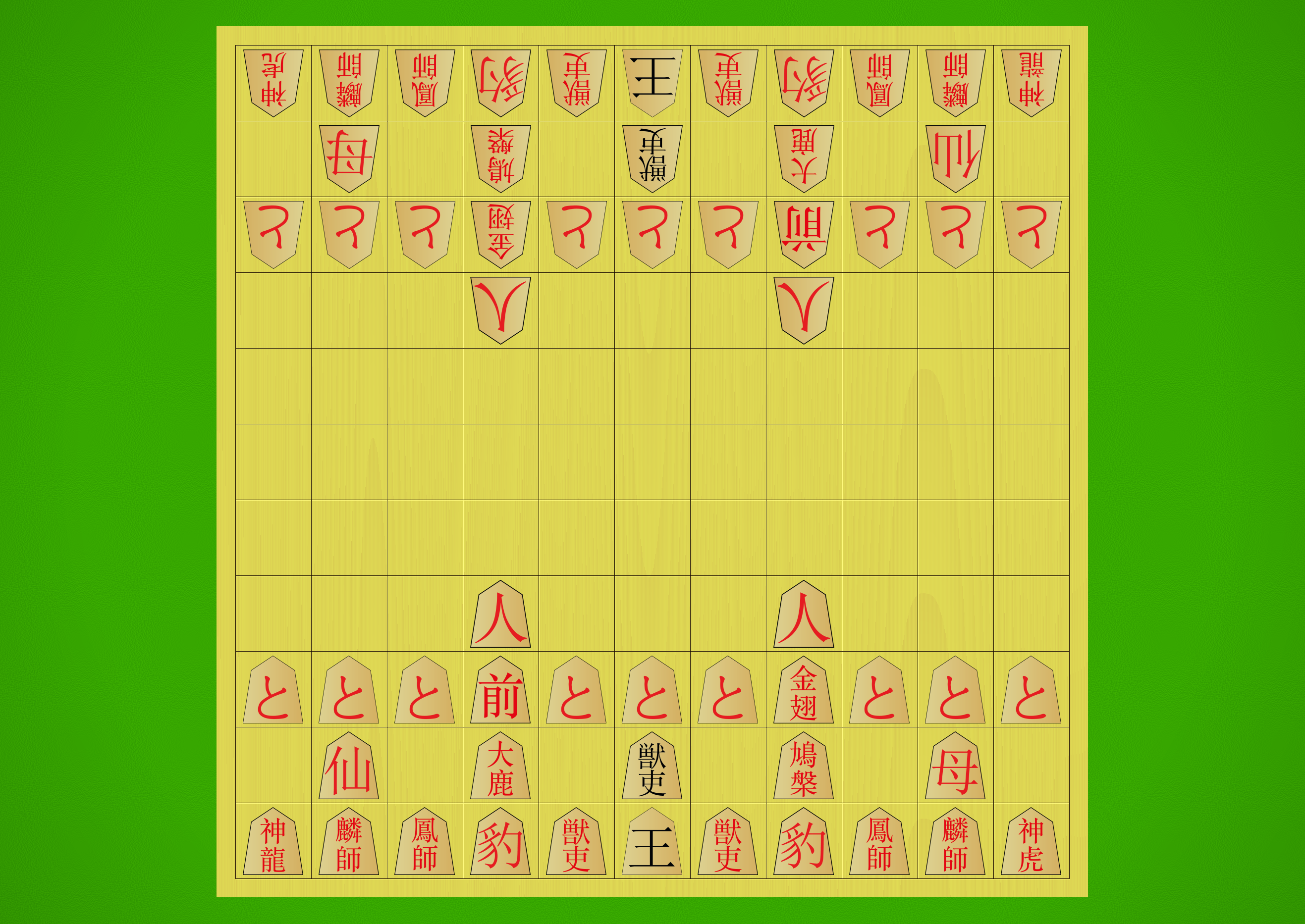 Starting array with kanji pieces flipped to show their promoted sides
