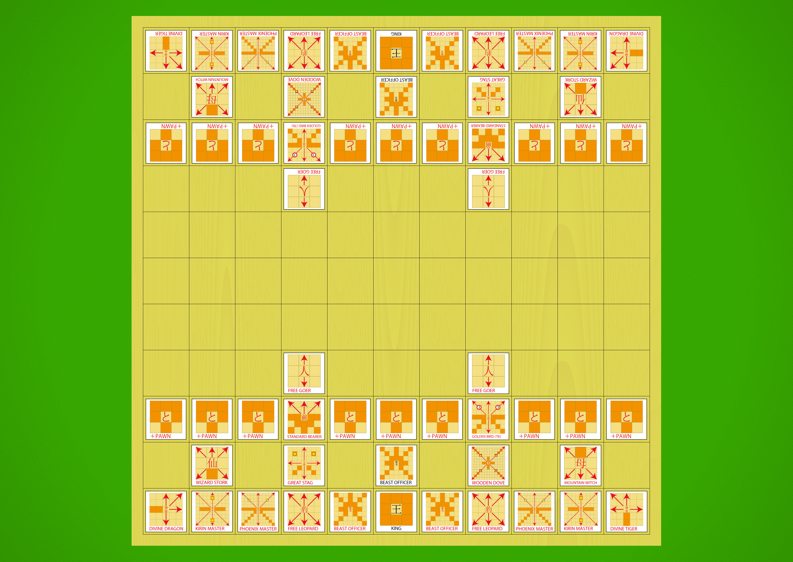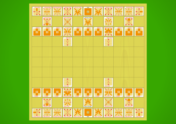 Starting array with diagrammatic pieces flipped to show their promoted sides