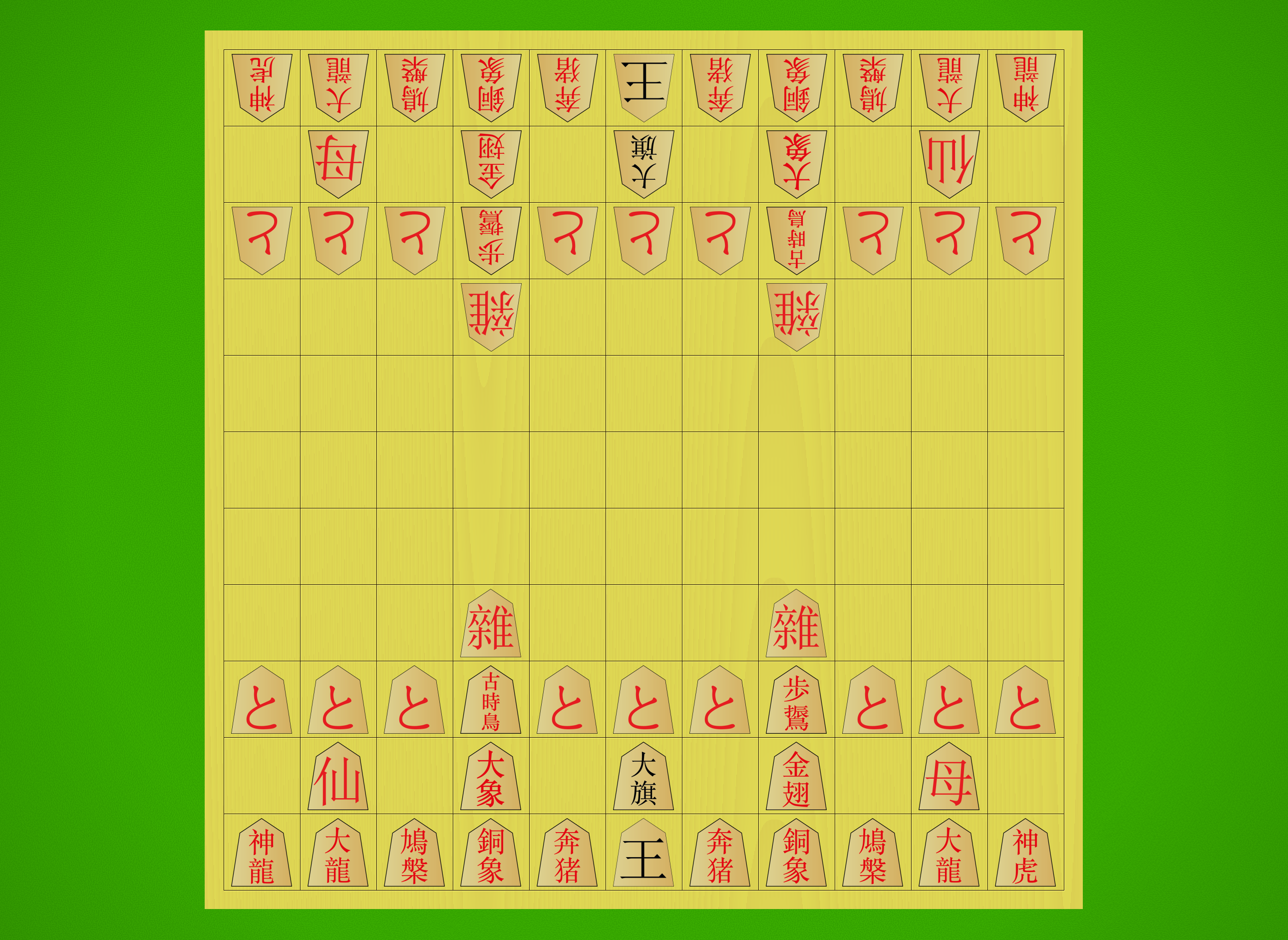 Starting array with kanji pieces flipped to show their promoted sides