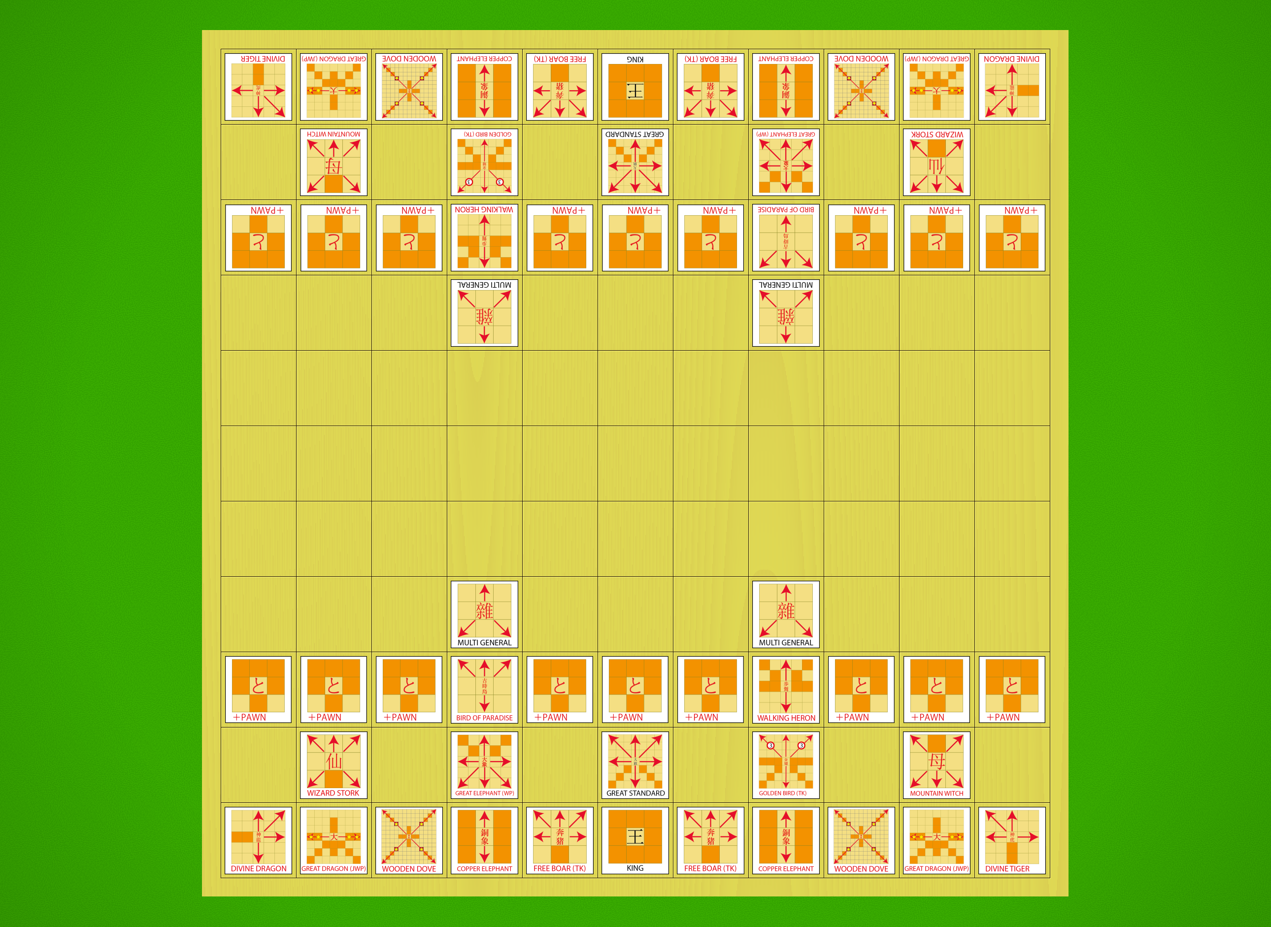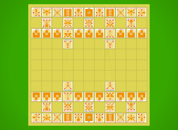 Starting array with diagrammatic pieces flipped to show their promoted sides