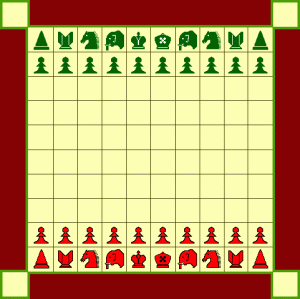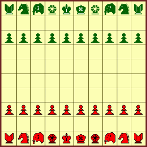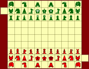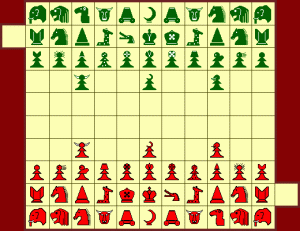 Alongside these two Camels and a Wildebeest on each side, the Wazir and Ferz pieces have been doubled up and parked in front of the King, creating an advanced forward line of Pawns. The Alfils are gone entirely, and the Queen is upgraded to its modern power levels. The King may also castle with his Rooks, and Pawns must promote at the last rank to Queen, Wildebeest or Guard.