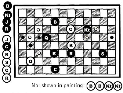 Rules-wise the game is easy to grasp — all the familiar pieces from Chess move as in the modern game, including the Queen and Pawns. No castling is allowed. Pawns that reach the far rank must promote to any previously-captured piece of the same colour.