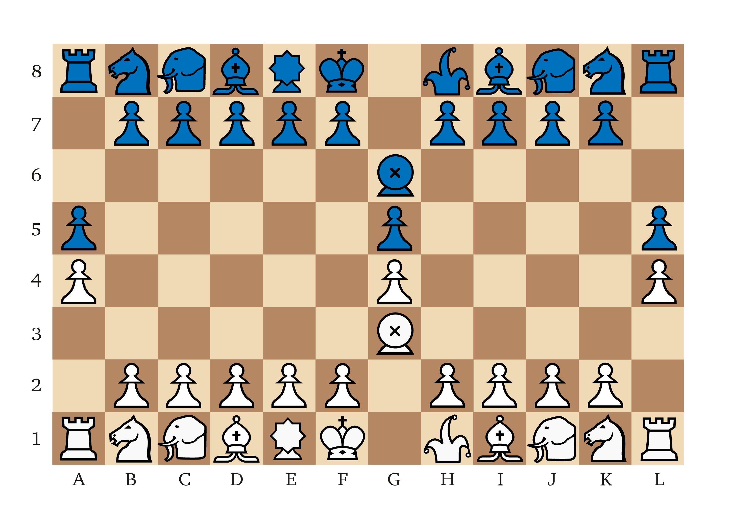 All told, I enjoy this variant quite a bit and find it a nice balance between rough-and-tumble tactics and slow-burn positional play. If you fancy experimenting with a very long board and some unusual pieces, I can highly recommend giving this a try.