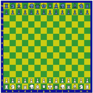This game is a bit of a mystery in some ways — despite the name being Alekhine Chess it has nothing to do with the famous Chess player Alekhine. Why is it called Alekhine Chess then, you ask? I have no idea. But that aside, it’s an intense and dramatic variant on a 14×8 board, and a good choice for fans of brutal tactics.