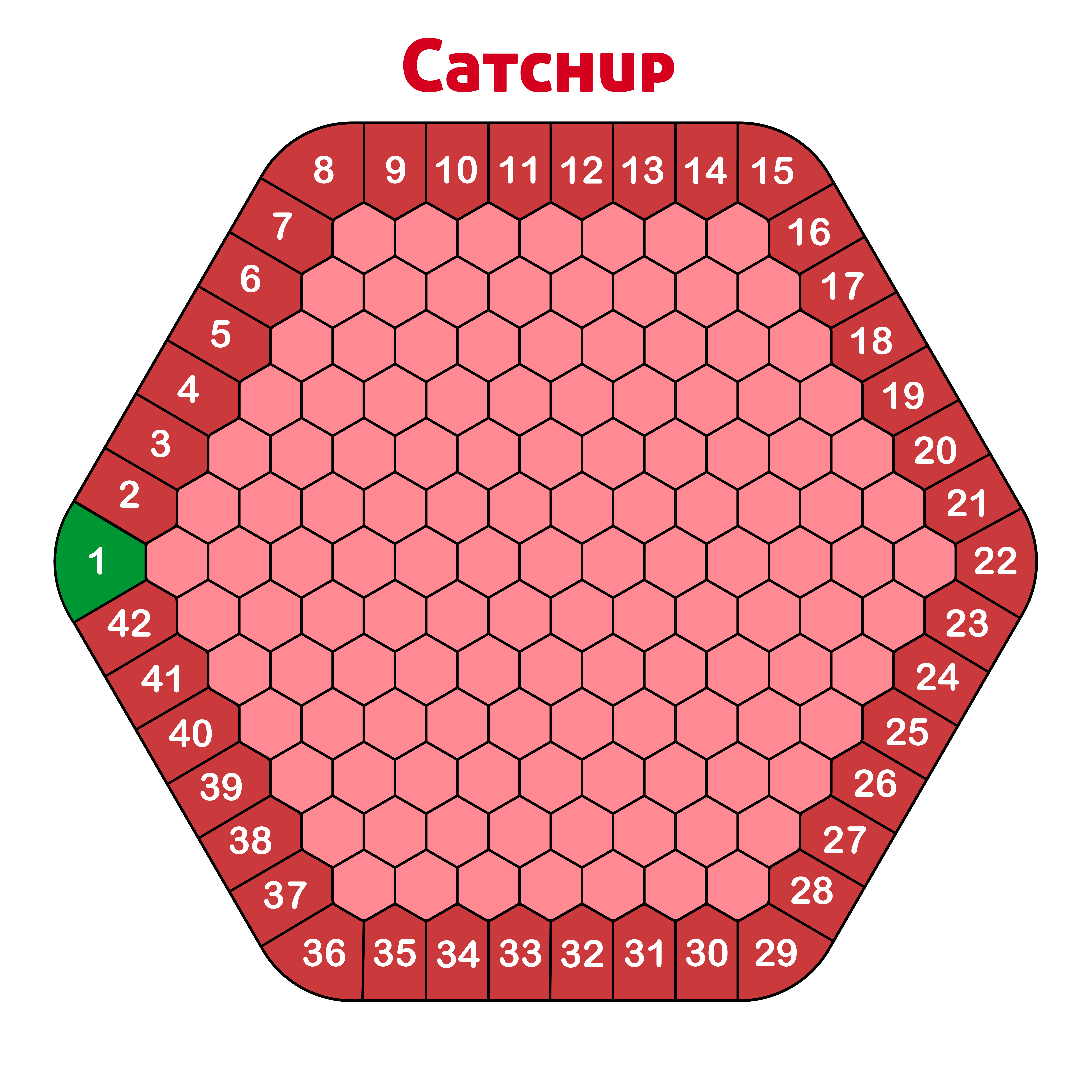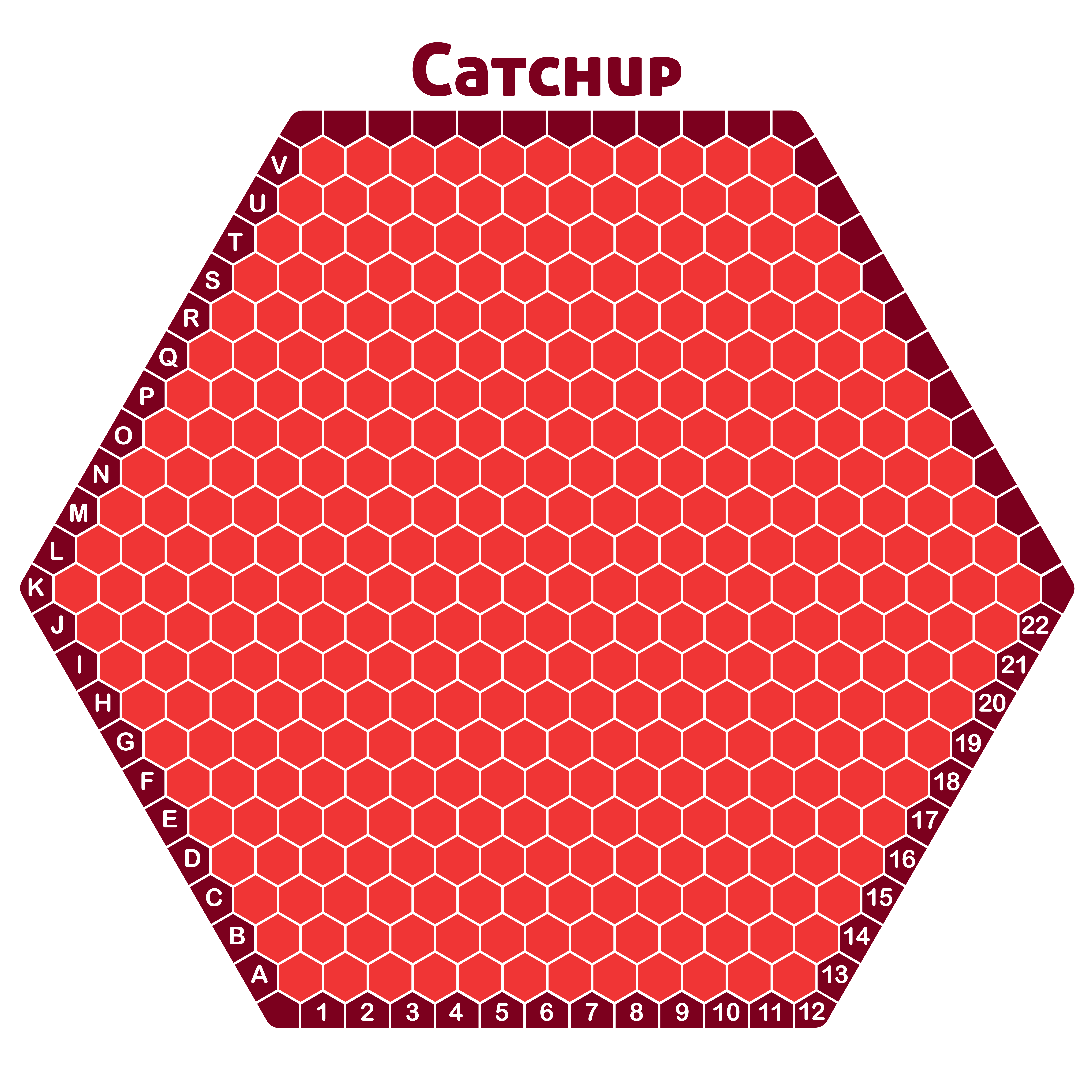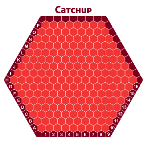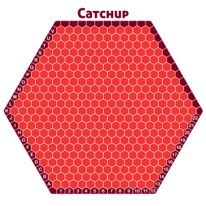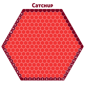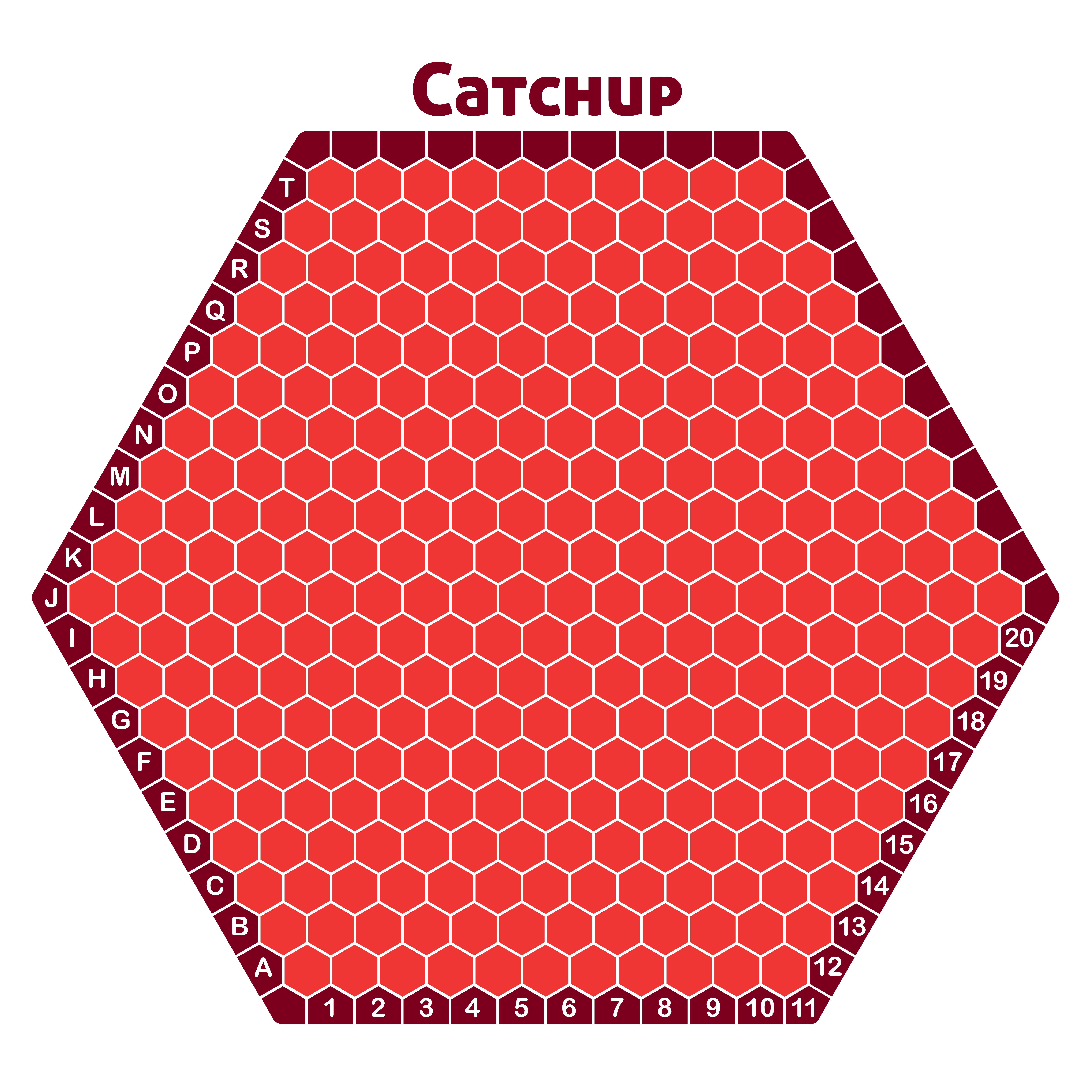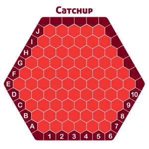 About the boards: The board on the top left above is a standard hexhex board, seven hexes on a side, with a scoring track where players can place a stone on the number representing the size of their current largest group. The other five are variant boards with uneven sides, which an experienced Catchup player has suggested may generate more interesting play.