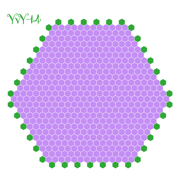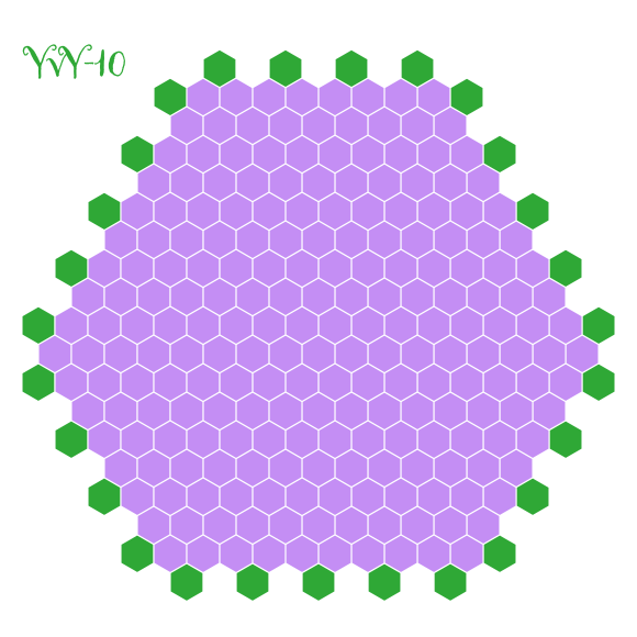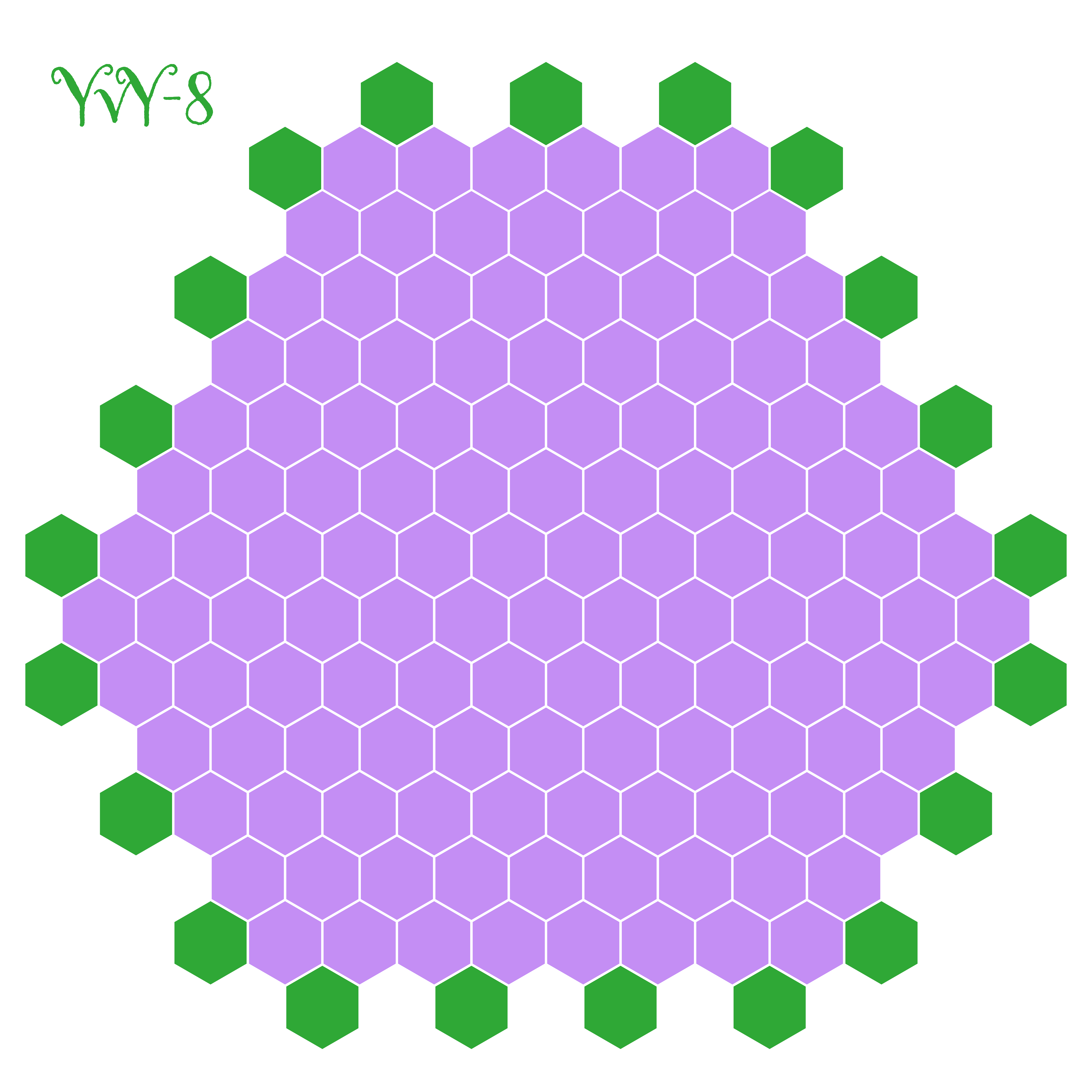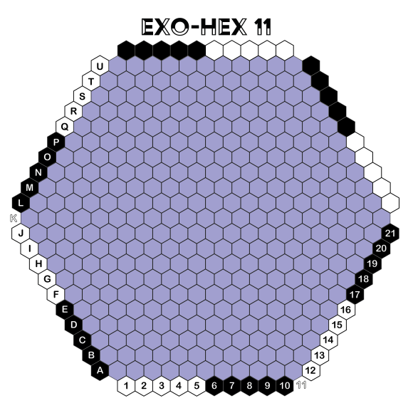 About the boards: As per usual, I made a few different sizes of boards for this game, to allow potential players to choose a game length that suits them. The YvY board is oddly shaped, with three of the sides being two hexes longer than the other three; as a consequence of this shape and the need to place sprouts evenly around the outside edges, the boards all have even-length sides. As is typical with games like this, the larger boards produce longer games of greater strategic complexity; the size-12 board above has 330 interior cells and 33 sprouts for a total of 363 cells, almost exactly the same as a Go board’s 361 points. The size-12 board is thus suited for intense strategic contests; the size-8 board is great for beginners and more casual games, while size-10 offers a nice balance between depth and brevity. If you’re feeling particularly adventurous, have a go on the size-14 board, with a whopping 468 interior cells and 39 sprouts.