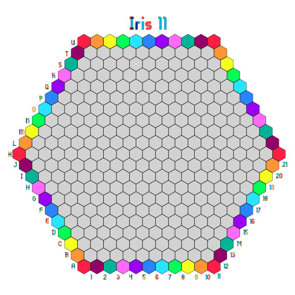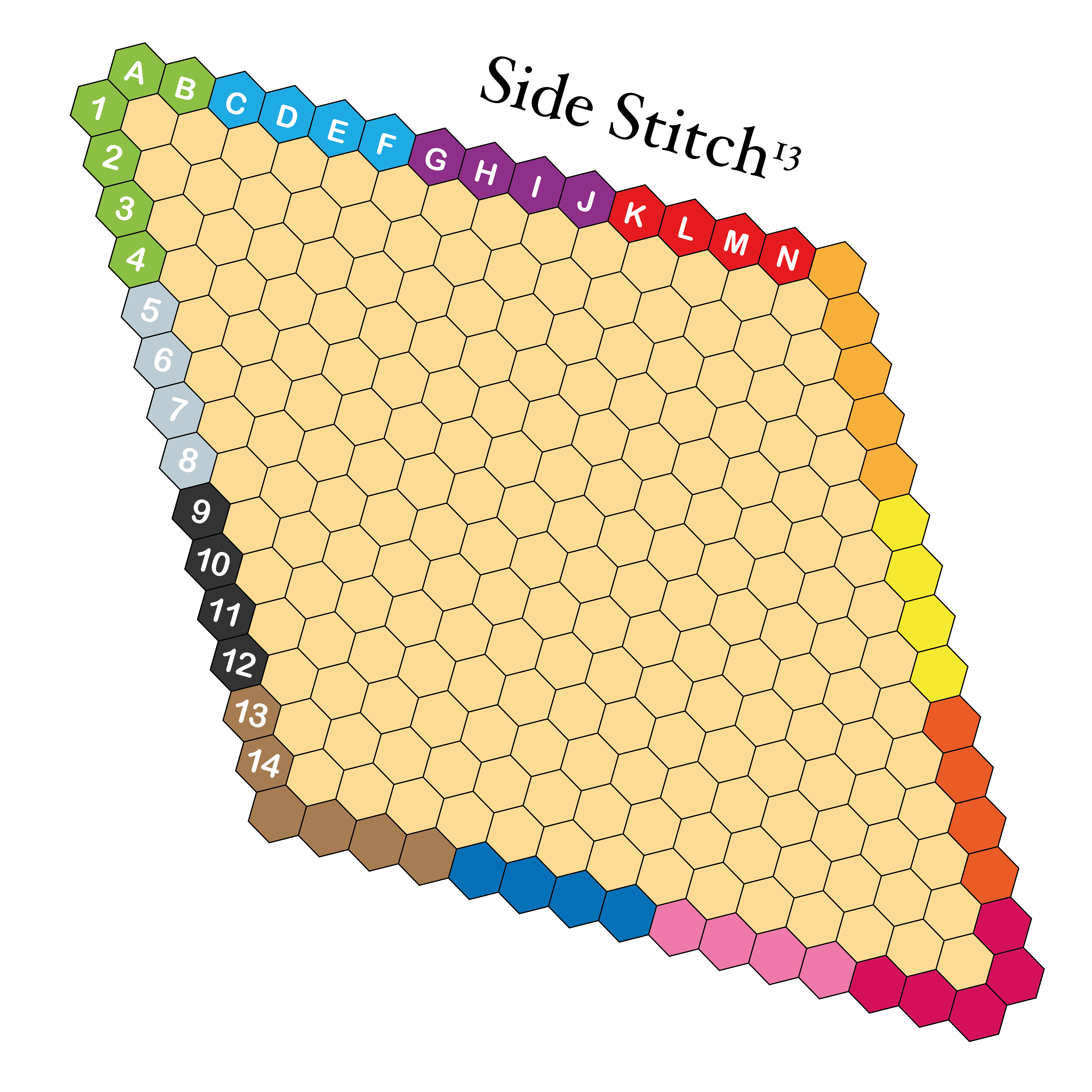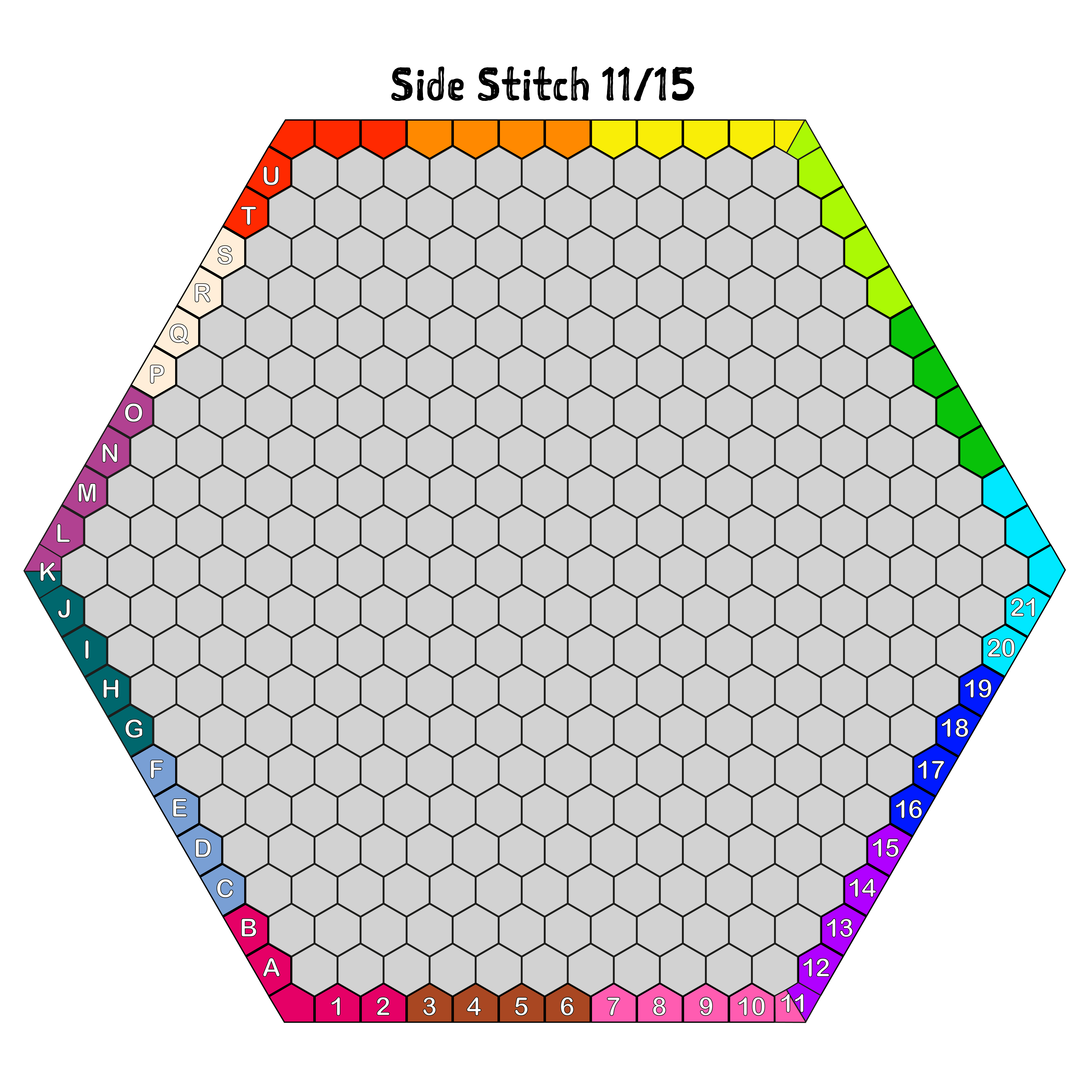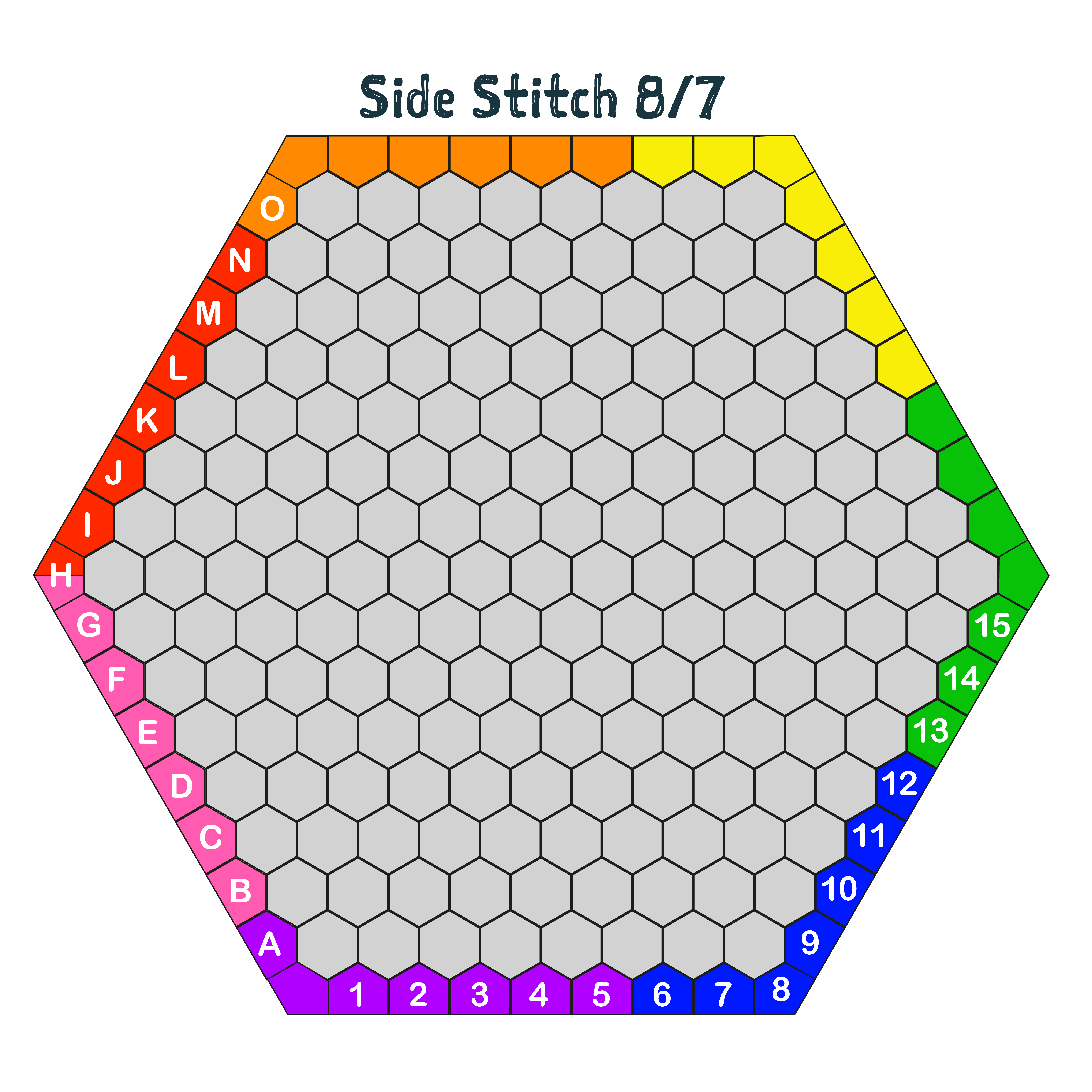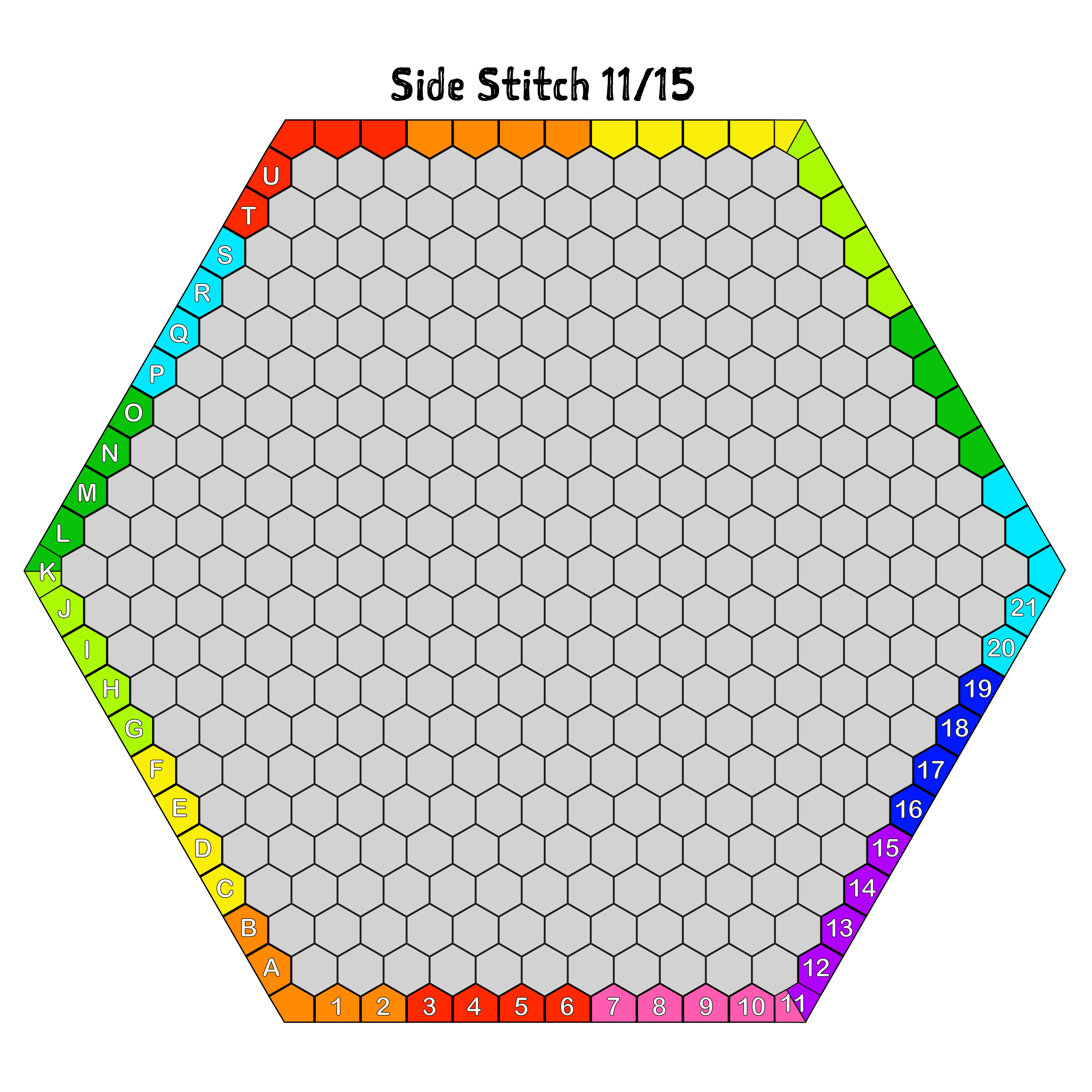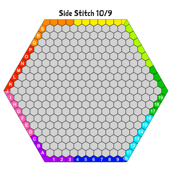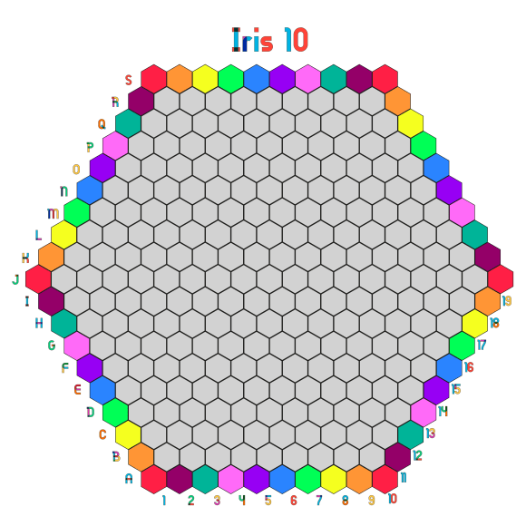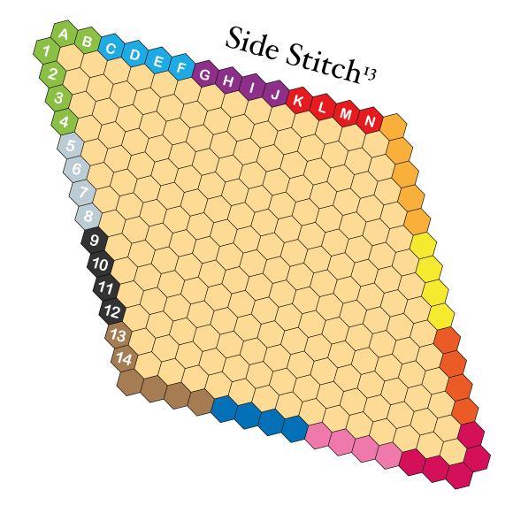 About the boards: All of the boards above were based on designs originally uploaded to BoardGameGeek by the inventor of the game, Craig Duncan; I have simply replicated them in Illustrator and made them as clean and sharp as I can. The ‘standard’ Side Stitch board is the hexhex-8 with 7 colour-sides (top middle in the above array). The hexhex-7/9-colour board is great for quick games. My personal favourites are the hexhex-10 with 9 colour-sides and the hexhex-11 with 15 colour-sides; note that I have two variants of the 11/15 board available, one with some repeated colours and another with all unique colours. To my shame I have not tried the 14×14 Hex board version yet!