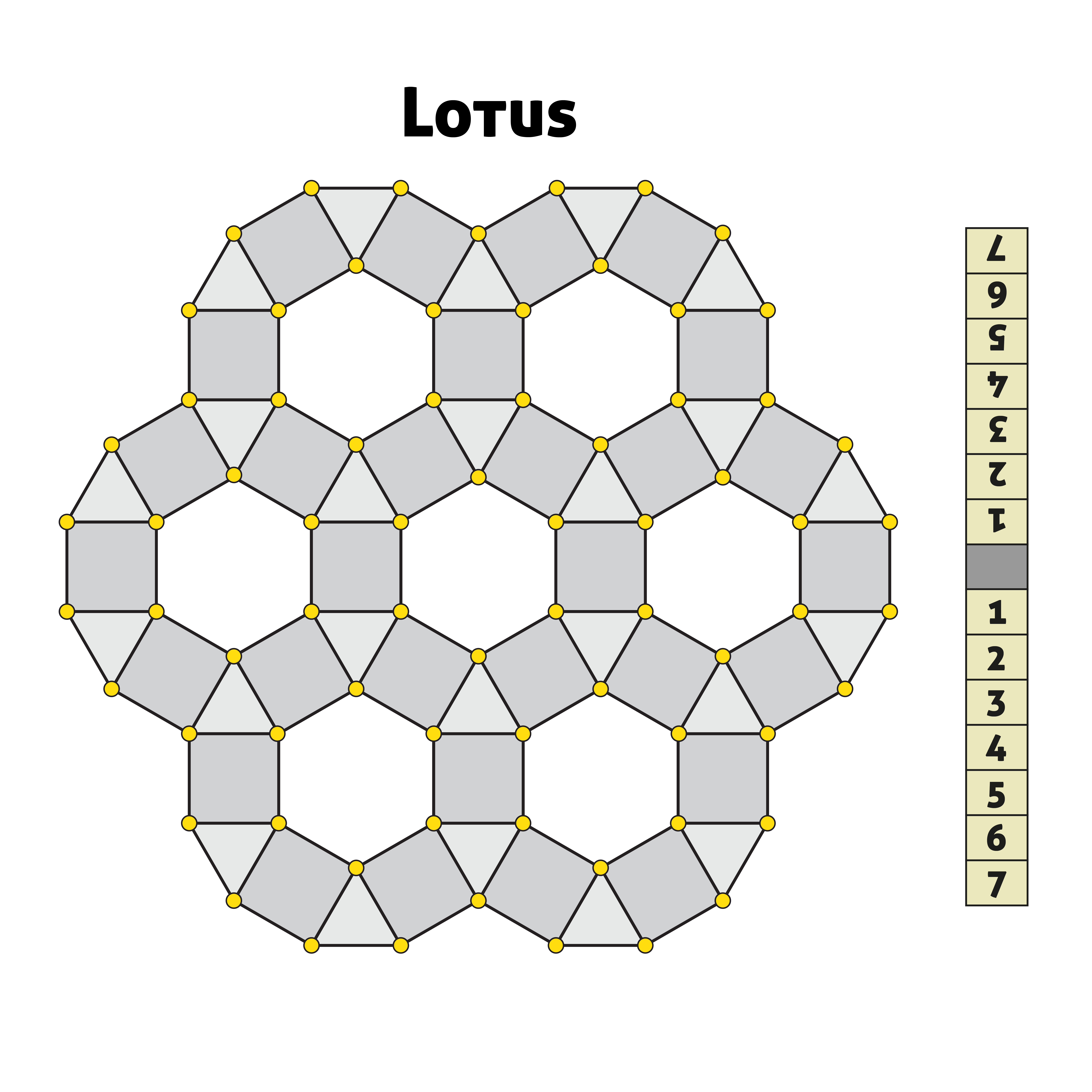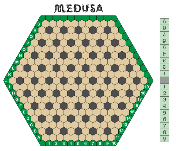 Lotus and Medusa are two under-appreciated territory games by Christian Freeling that are closely related — in fact Christian calls Lotus the ‘support act’ for Medusa. Both centre around the use of a mechanic from a game called Rosette. Over the years, numerous designers have tried to transport the game of Go to the hexagonal grid, only to find that the reduced connectivity of each point (from 4 adjacencies to 3) made it too hard for players to build stable groups of stones. Rosette addressed this by allowing groups of stones containing a rosette — a formation that occupies all six points of a single hexagon — to be immune from capture permanently. Lotus and Medusa adopt this clever tweak, while adding some fascinating additional touches.