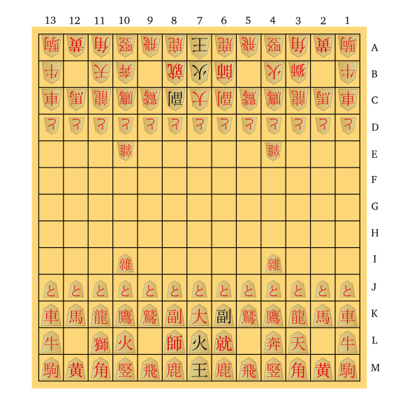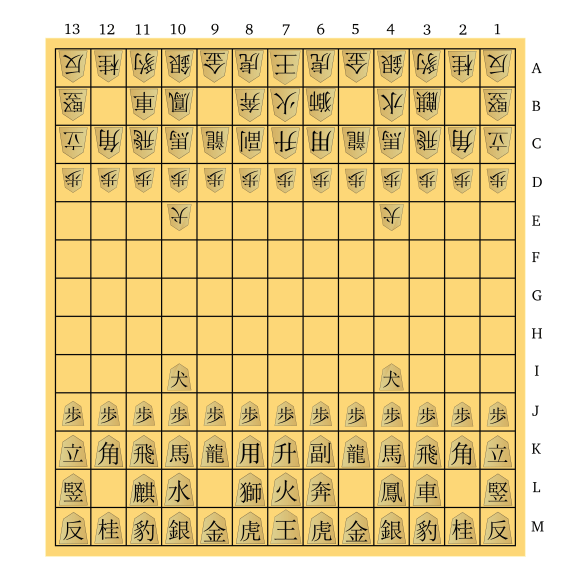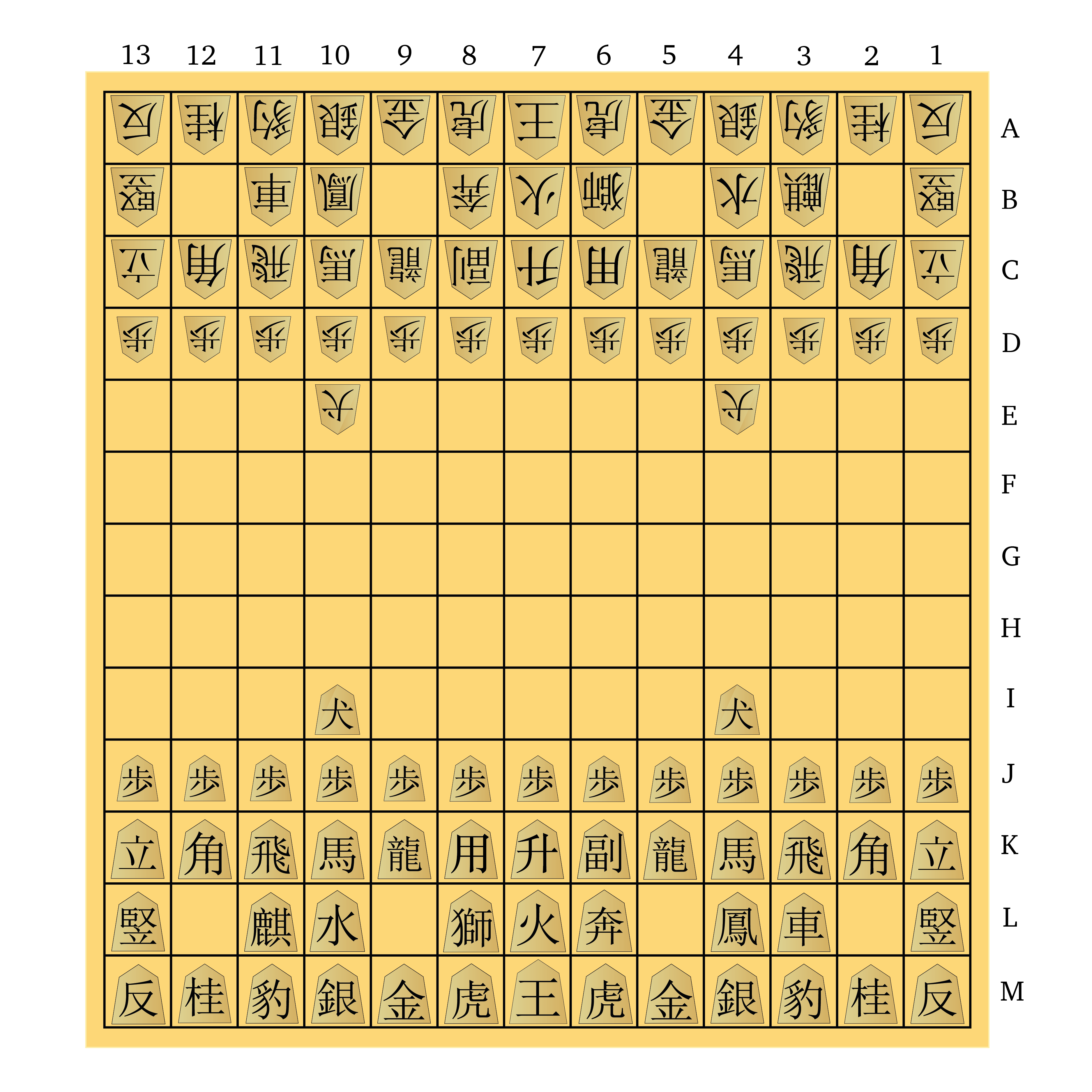 Nutty Shogi is here as a representative of the class of 13×13 Shogi variants. The only historic 13×13 Shogi variant is Heian Dai Shogi, which is a very early form of Dai Shogi that is unfortunately not very enjoyable to play. However, some modern Shogi variant fans have created some 13×13 variants that are worth your time, and given that 13×13 Shogi boards are not available anywhere, I decided to create one to print on a mat.
