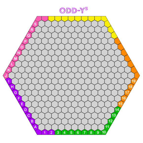 Why they’re great: Odd-Y circumvents one of the shortcomings of Y, in my opinion, which is that the triangular Y board gives different areas of the board very different values, which means some parts of the playing area go largely unused. Odd-Y extends the goal of forming a Y — connecting three sides of the board — to boards of more sides, creating a more expansive feel. The new winning condition is a bit complicated to explain on larger boards, but Odd-Y with five sides — 5-Y — is beautifully simple: connect any three sides to win, so long as all three sides are not adjacent. This can then be translated to a six-sided hexagonal board by colouring the edges with five colours in a pattern like you see above (Craig Duncan came up with this idea). 5-Y feels very freeing — there are more winning connections available than in Y, creating more strategic complexity, and the entire board surface feels useful.