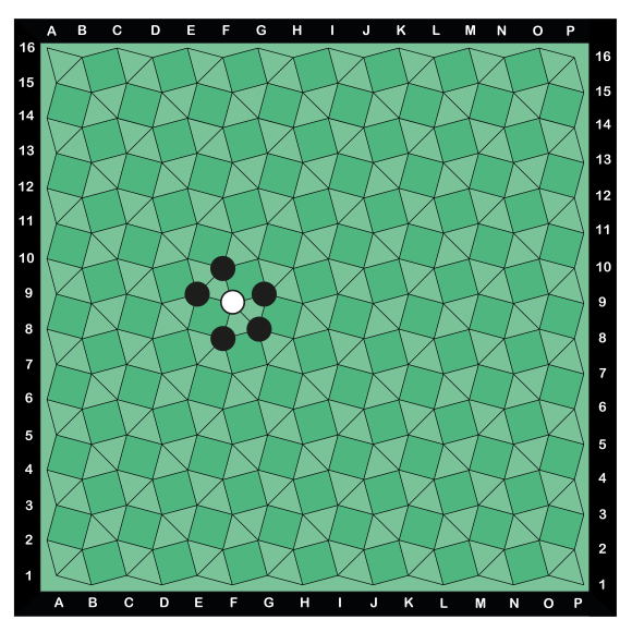 Why they’re great: *Star is the final iteration of Craige Schensted/Ea Ea’s set of connection games built around the goal of claiming edges and corner cells, then connecting groups of those cells together. *Star is a bit hard to understand at first, but once you get going, you’ll find a dynamic game of territory and connection, where both players writhe hectically around each other trying to weave their scoring groups together. The resulting play is complex and challenging, and games of *Star often exhibit subtle and sophisticated strategies. The *Star board also supports two excellent variants: Double Star, where players may place two stones per turn instead of one; and Star-Y, a pure connection game where players must connect three sides which are not all adjacent (just like 5-Y above).