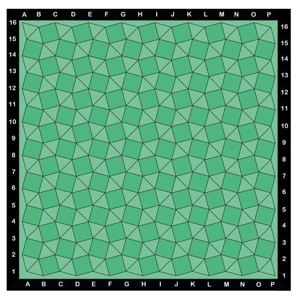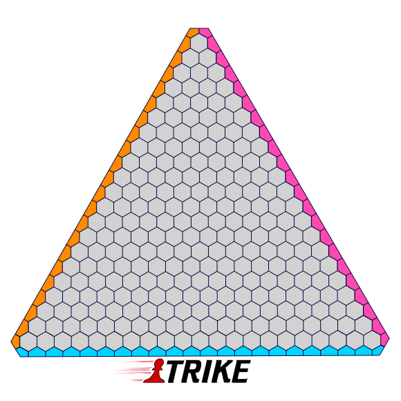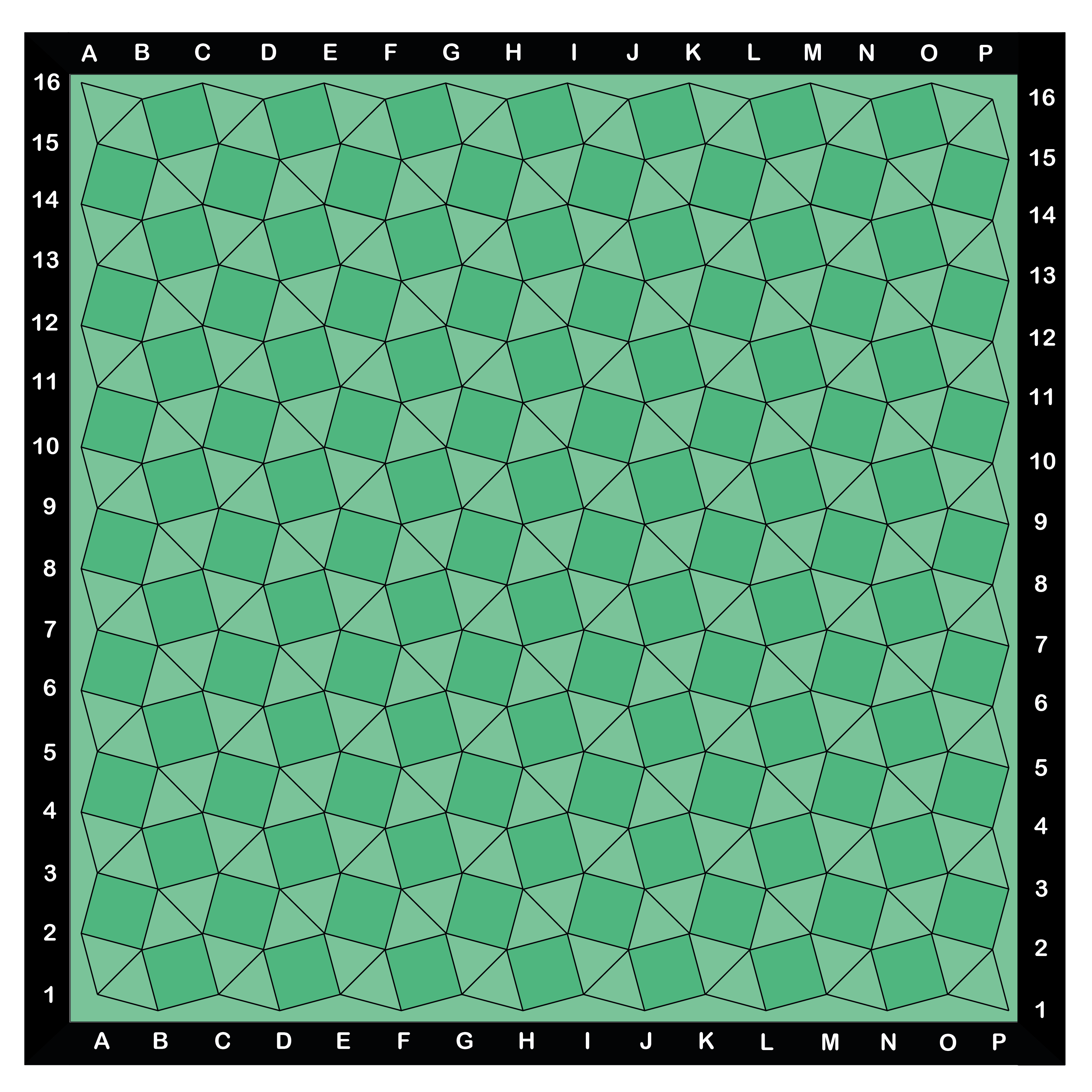 About the board: The board above is 17 points long on each side, meaning that games will be substantially longer and more balanced than on the 91-cell Kadon board. Besides being visually appealing, this board geometry helps balance the values of board cells. The downside is that I haven’t yet found a straightforward way to extend this board in Illustrator without reconstructing large portions of it, so for now this is the only large board of this type that I’ve made.