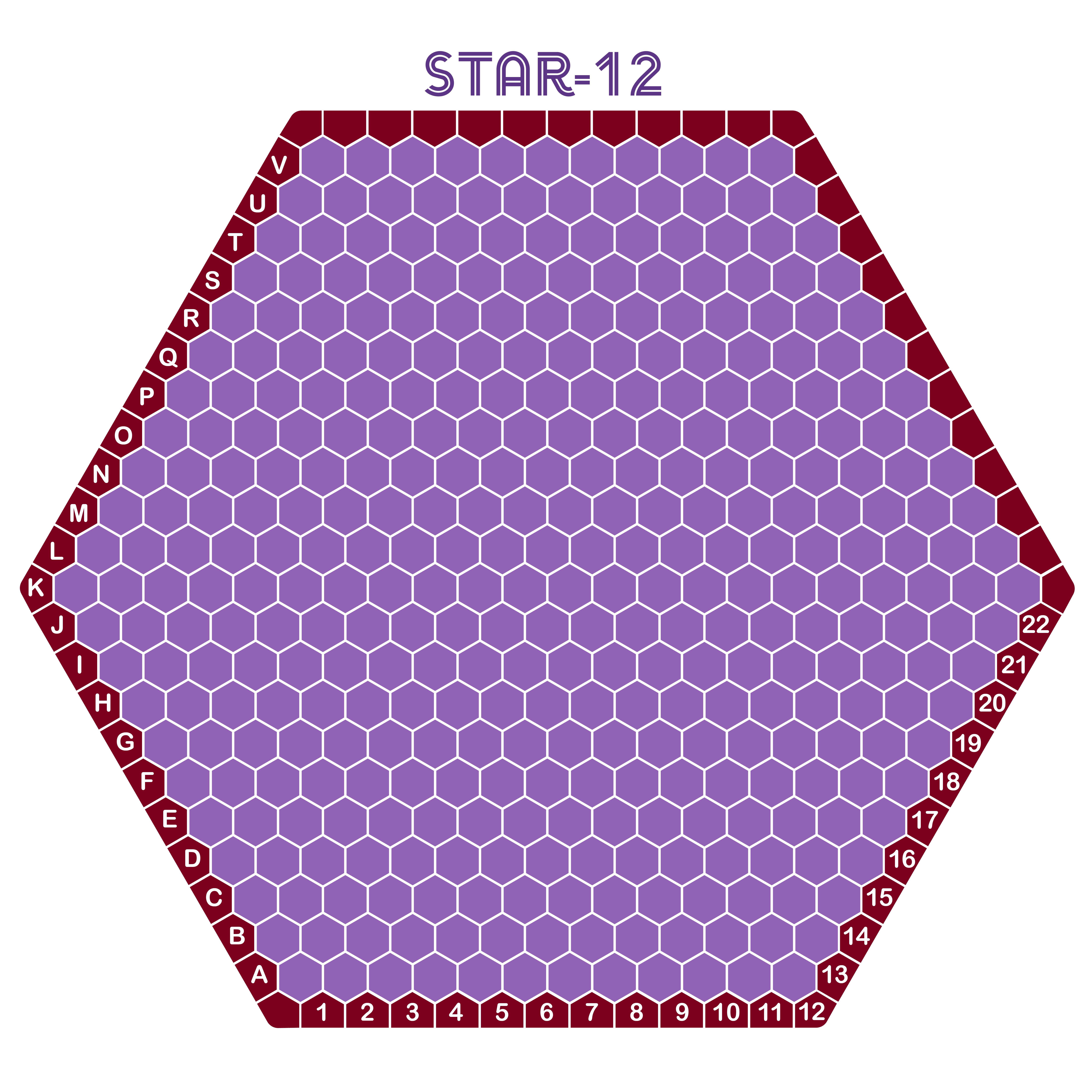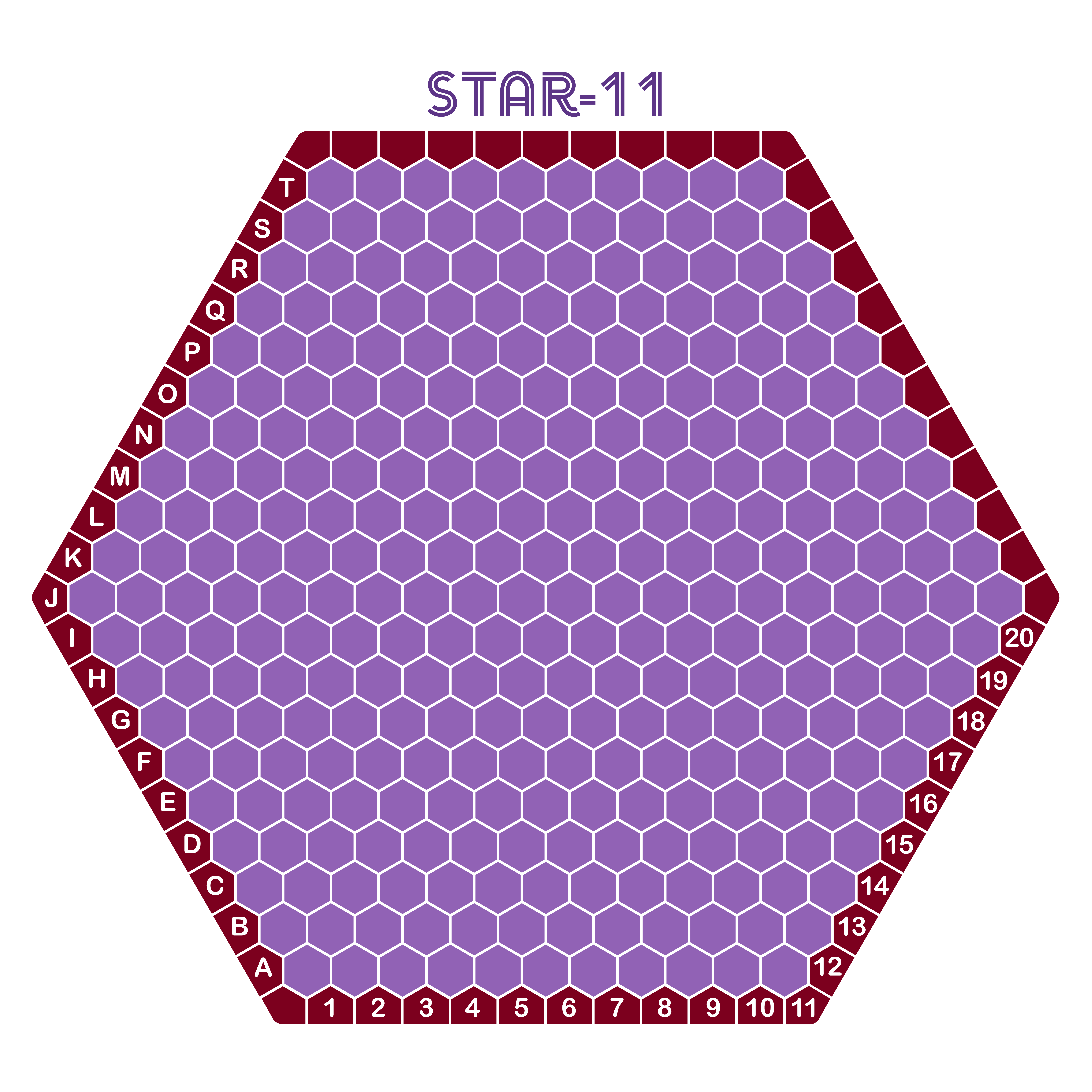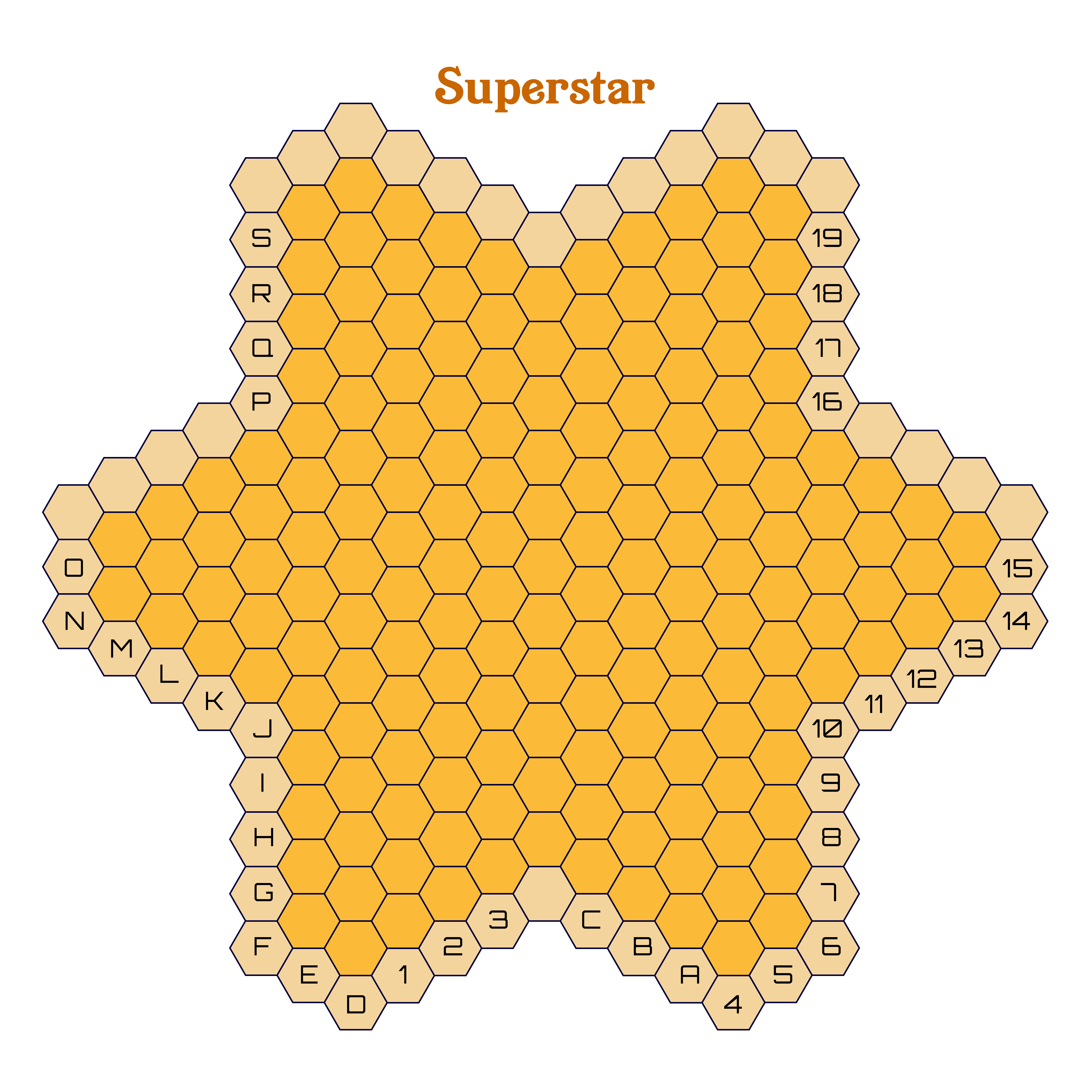 About the boards: My boards adopt the standard uneven hexagonal grid used by the original game, and simply extend that to larger sizes. I should note that the designer felt the corner cells, which on these boards would be worth three points due to being adjacent to three exterior edge cells, should be adjusted to only score two points; I don’t have particularly strong feelings about this, but in the future I do intend to make versions of these boards with corners altered in that way. Of course you can use these boards and simply adjust the scores accordingly when you play, but certainly having the scores clearly visible from the board geometry would be better. The largest board above, Star-12, contains 363 cells, similar to the Go board’s 361 points. Given that Star games often use most of the board, Star-12 is probably the largest size most players would be willing to use, and above that size the game is perhaps a bit too much of a marathon.