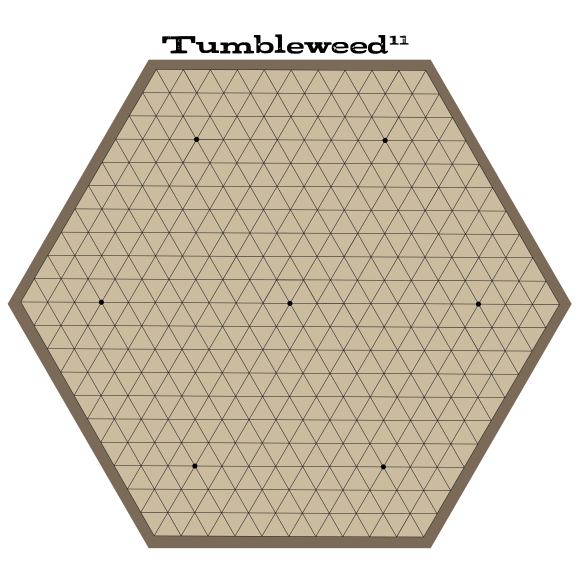 Tumbleweed is a game of territory based on a line-of-sight mechanic — on each turn you may place a stack of pieces of your colour in one cell on the board, with the height of that stack determined by the number of your pieces within unobstructed line-of-sight of that cell. You may capture and remove an enemy stack in that cell if your stack would be larger, or you can reinforce your own stack in the same way. At the end of the game, the player who holds the majority of the board wins. Tumbleweed is gaining a lot of attention since its creation, because the simple line-of-sight stack placement idea immediately creates interesting tactical situations and strategic dilemmas. Apparently the community of players is settling on hexhex-8 boards, but I prefer to play on the original hexhex-11 board. Playing in real life is a bit challenging, mainly because you need a huge number of counters to potentially stack them six deep on numerous cells, but playing online or via Ai Ai is straightforward and very enjoyable. My board above plays on the intersections rather than in the cells, which just intuitively makes more sense to me given the line-of-sight mechanic.