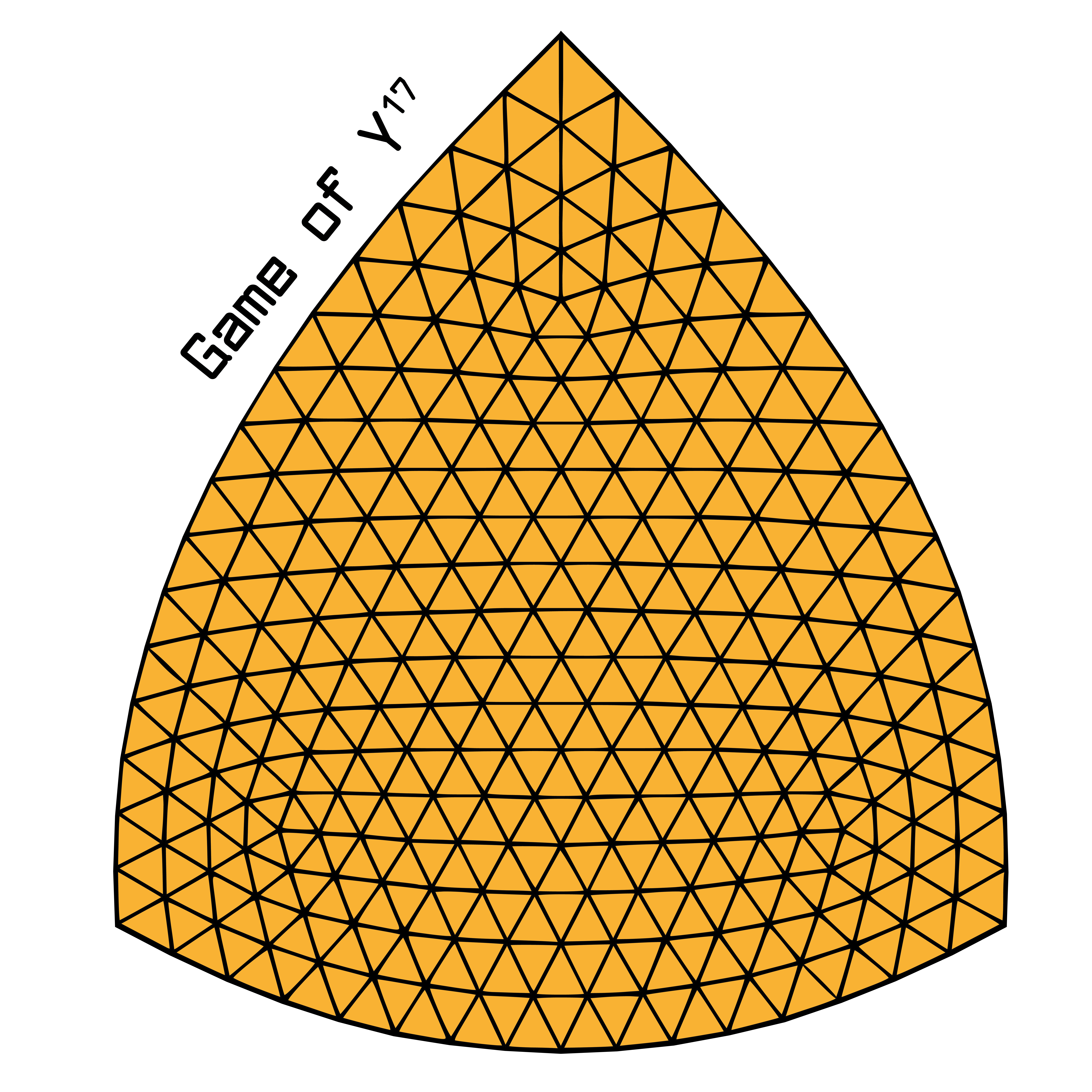 As I mentioned in the Game of Y/Poly-Y/Star/*Star article, the published version of the Game of Y uses a board of 91 points with a distorted triangular shape, designed to balance out the in-game value of the centre, edge and corner points. However, the board published by Kadon is simply too small, meaning that every opening move by the first player should be swapped. A better option is to use the same board geometry but substantially larger, and that is what I have attempted with this board.