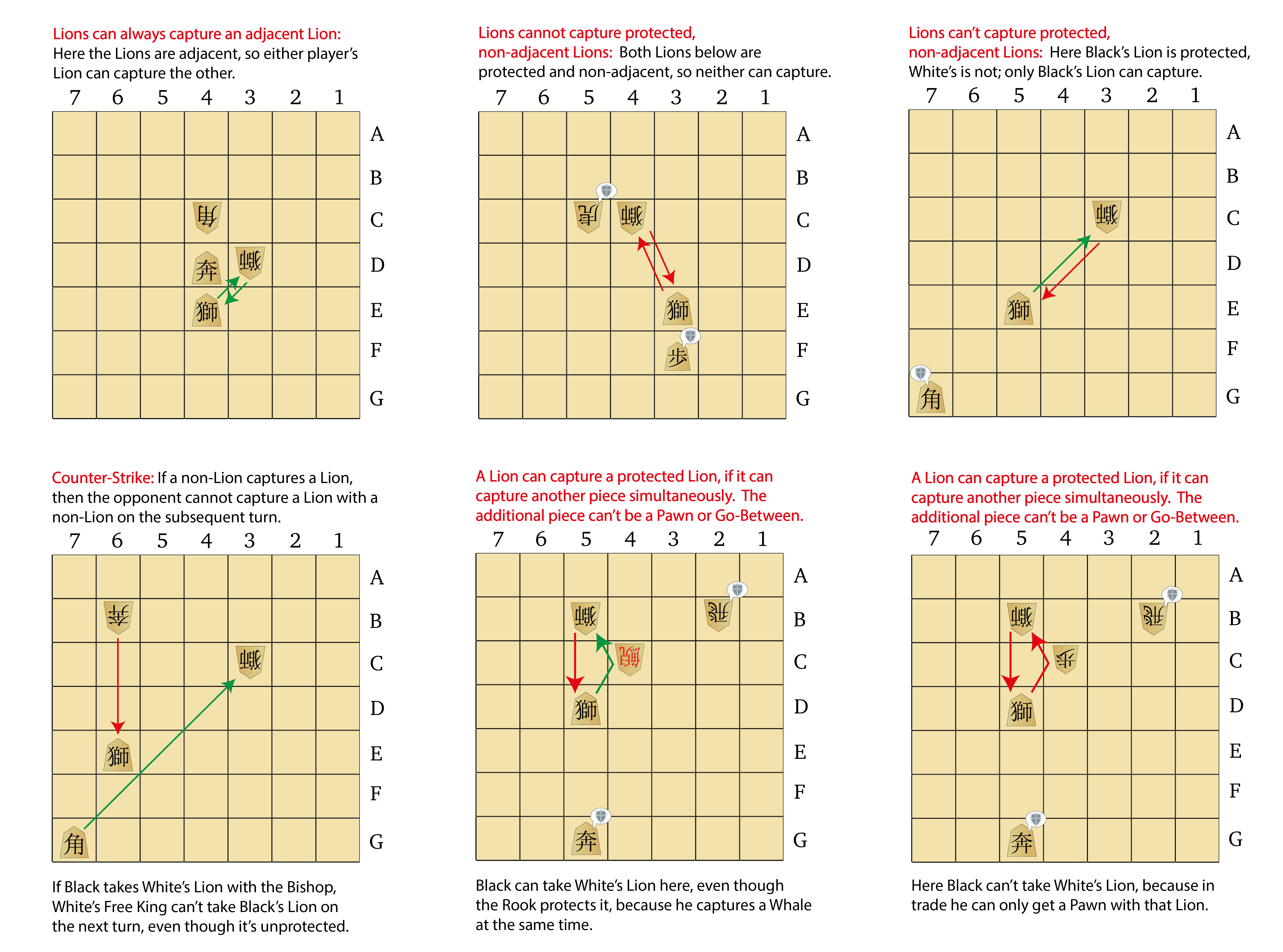 These kinds of unique moves are characteristic of these old games. Perhaps the most iconic piece of the large Shogi variants is the powerful Lion that can move and capture twice in a turn, but the Lion and its many cousins are simply too strong to live happily in a drops-based game. So instead I selected pieces with unusual sliding modes from Tai and Taikyoku Shogi, which are still strong and unique but not overpowering. These pieces also add further dynamism to the game by providing moves that neatly ignore dense defensive formations, forcing players to adopt flexible defences. I found that having a few leapers in this game also helped counterbalance the much higher attack density, and prevented games from dragging on for too long due to an overabundance of defensive power.