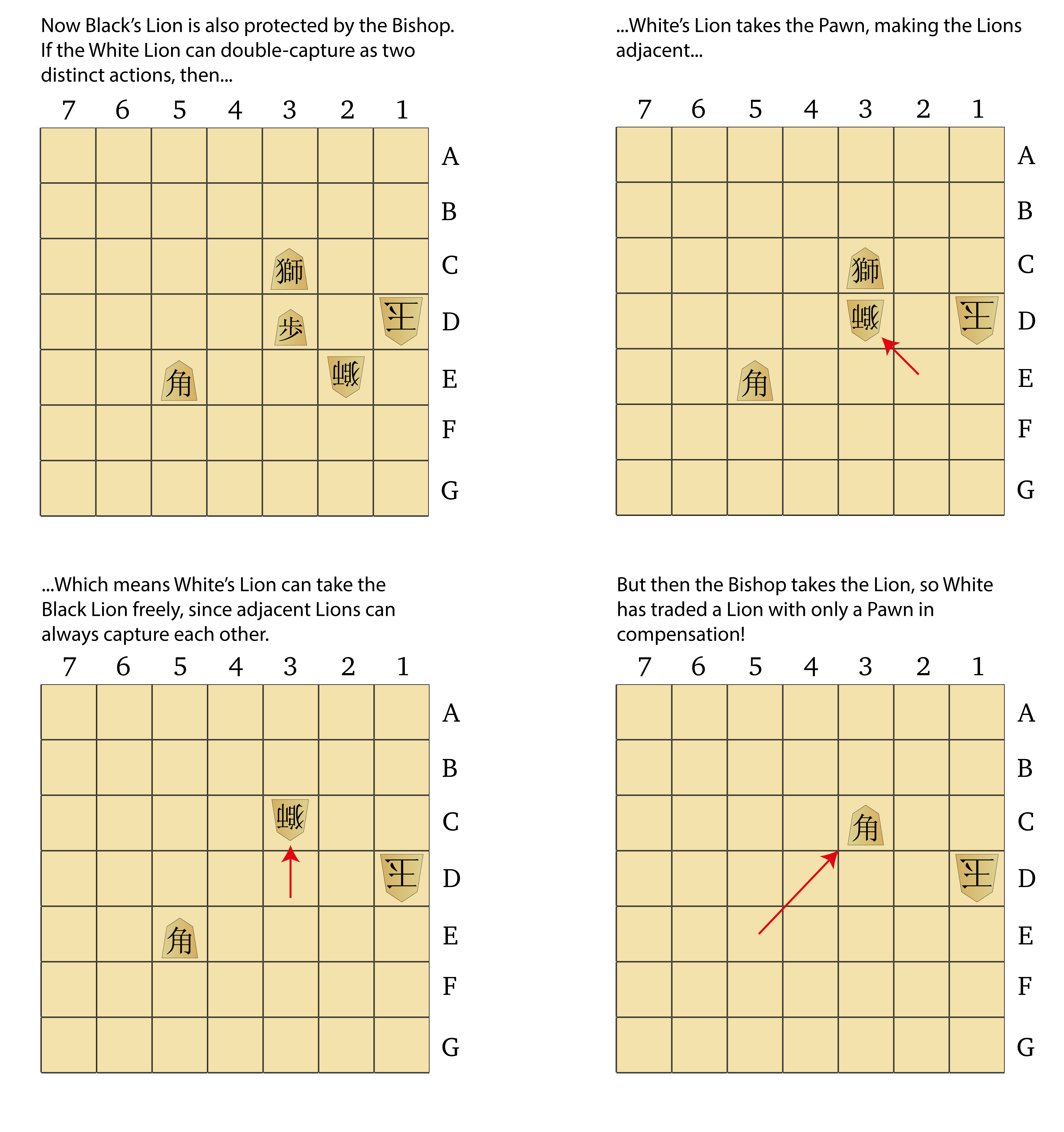 Having spent ridiculous amounts of time on Shinjuu Shogi at this point, and a number of related drops-based variations during testing, I’ve convinced myself that both these issues are not as bad as they seem and the pitfalls they identify can be avoided.