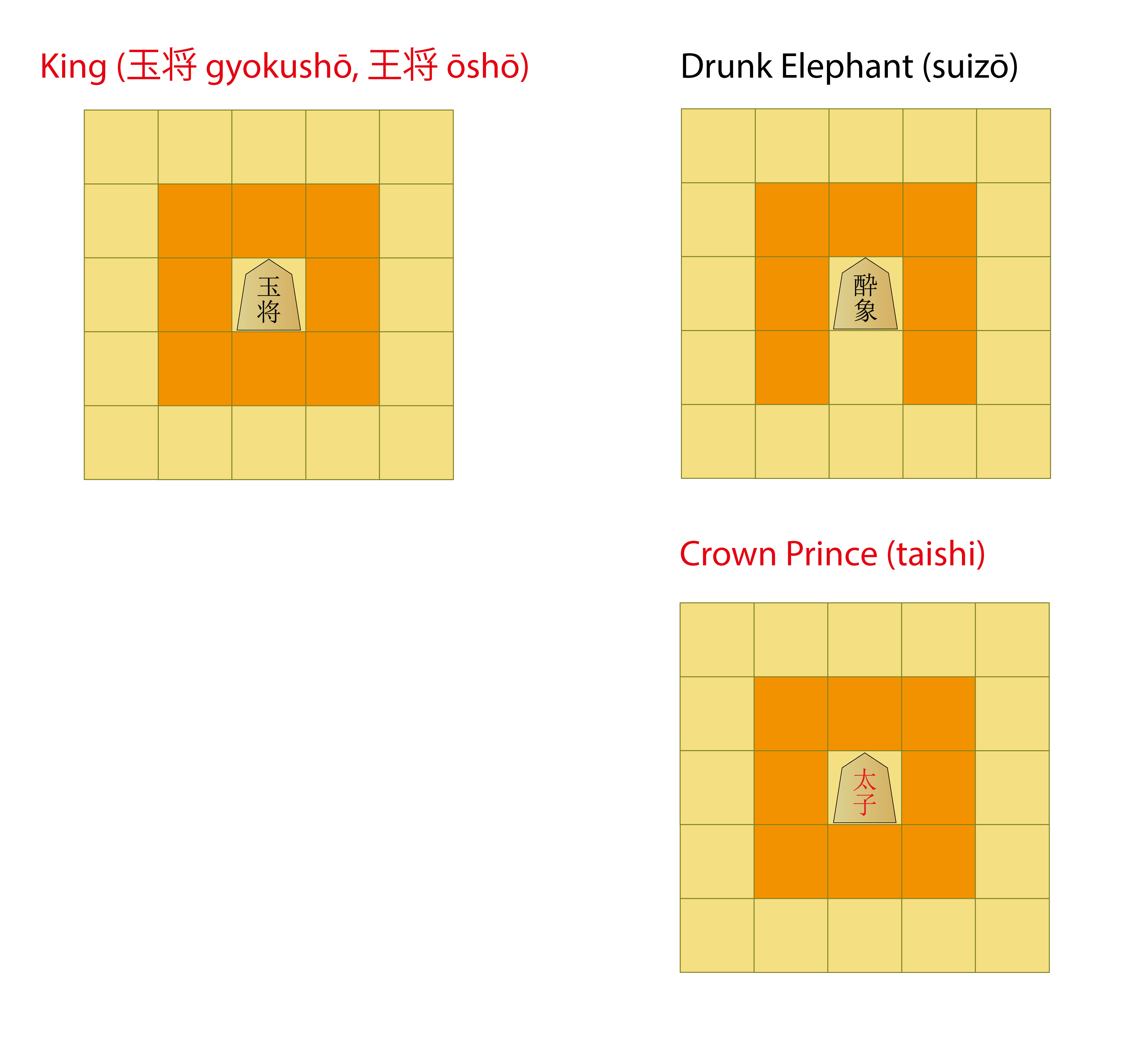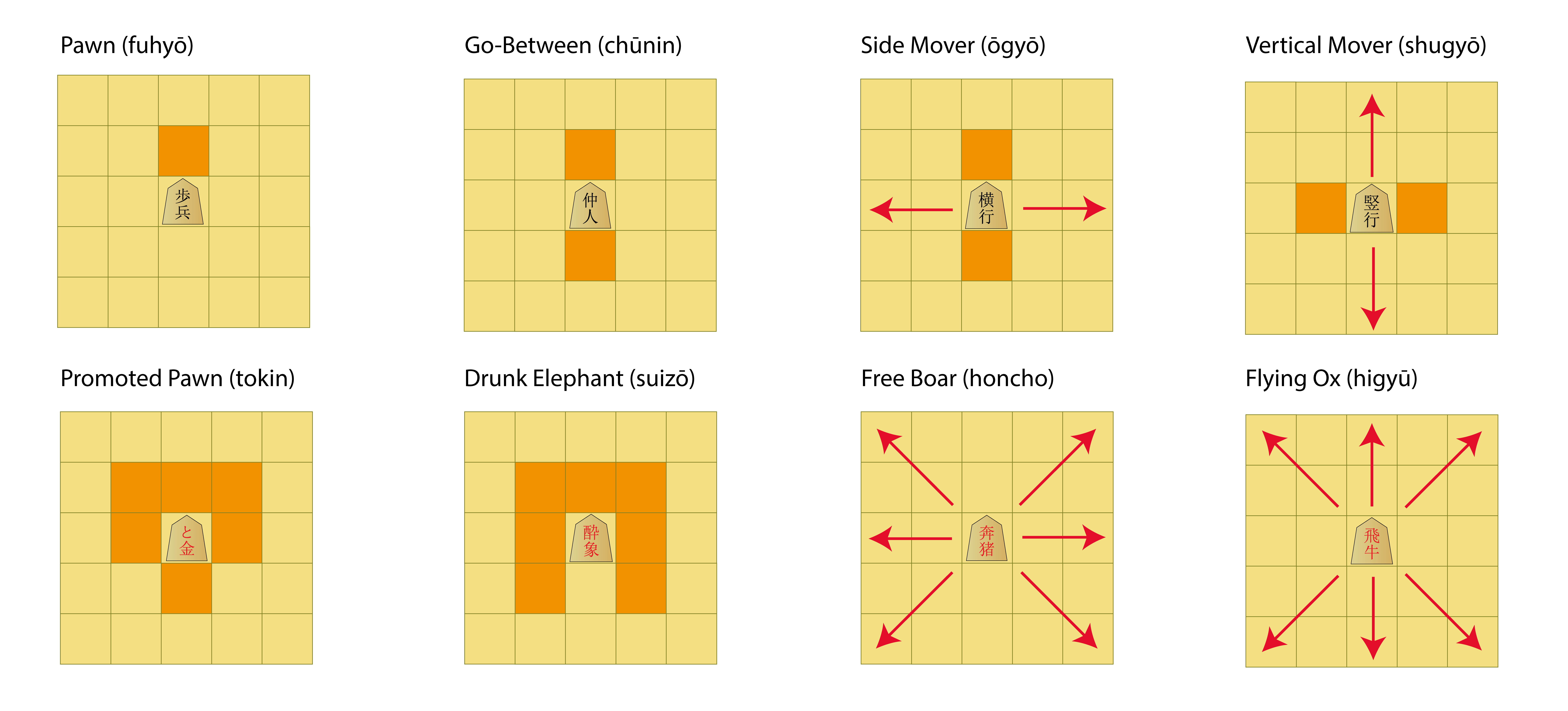 - The Pawn, Gold General and the King are present across all variants (except Tori and Wa).