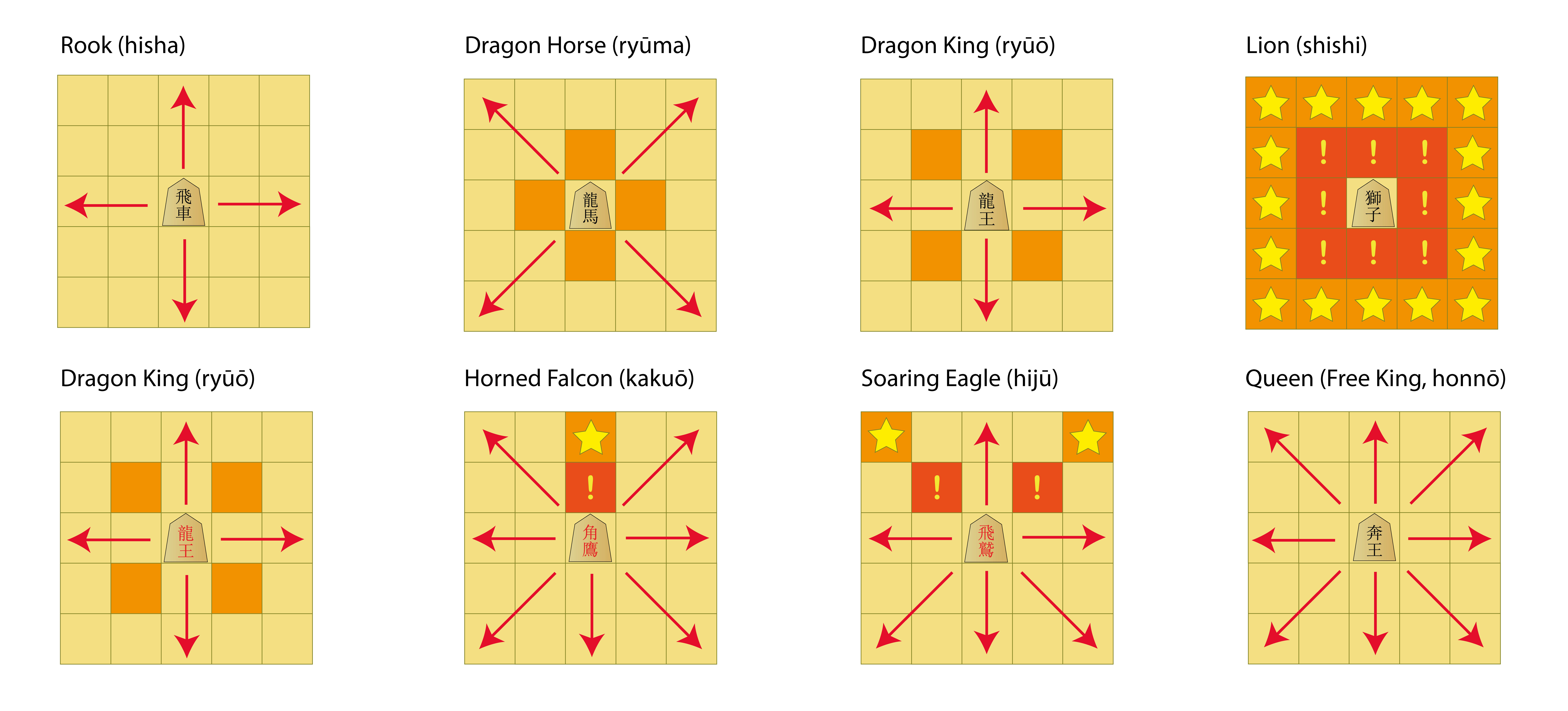 - Various pieces and promotions come from Taikyoku Shogi: Great Standard; Walking Heron (promoted Fierce Eagle); Bird of Paradise (promoted Old Kite); Wooden Dove (promoted Phoenix); Free Boar (promoted Gold General); and Copper Elephant (promoted Ferocious Leopard).
