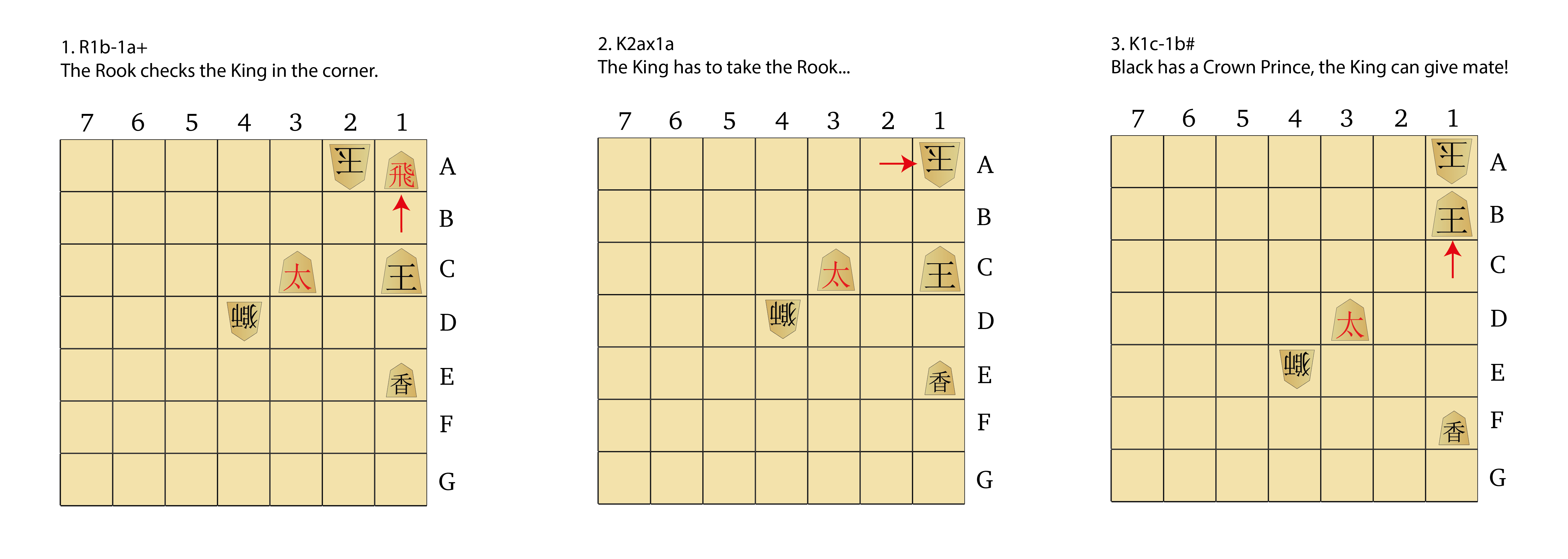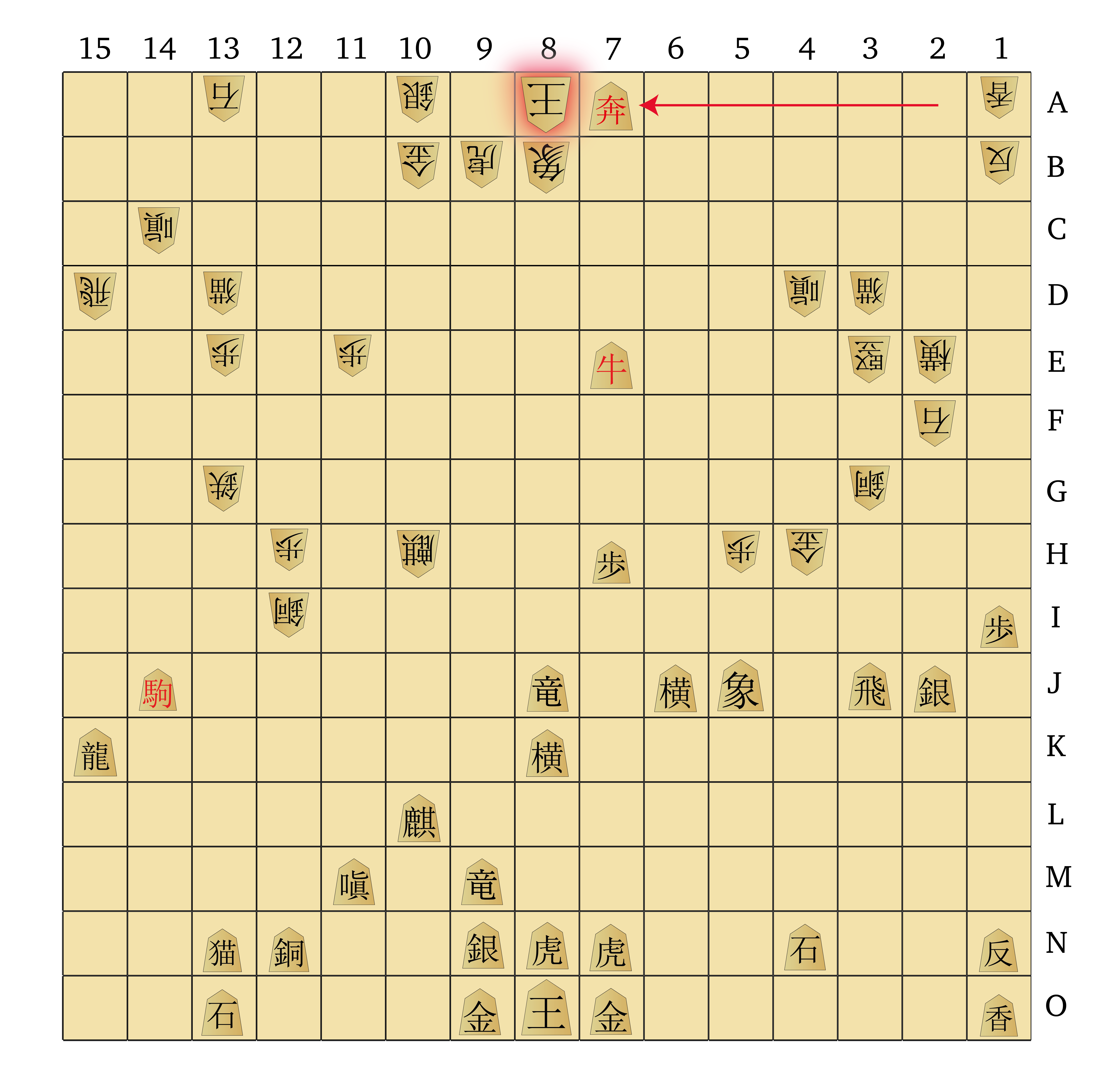 From there, Gote launches a vicious attack that completely bypasses Gote’s massive central castle, and Sente’s desperate counterattack fizzles due to Gote’s more flexible defensive structure on the back ranks. As Sente’s offensive splutters and dies, Gote seizes the moment and forces an unusual checkmate with Blue Dragon, Great Dragon and Fierce Eagle: