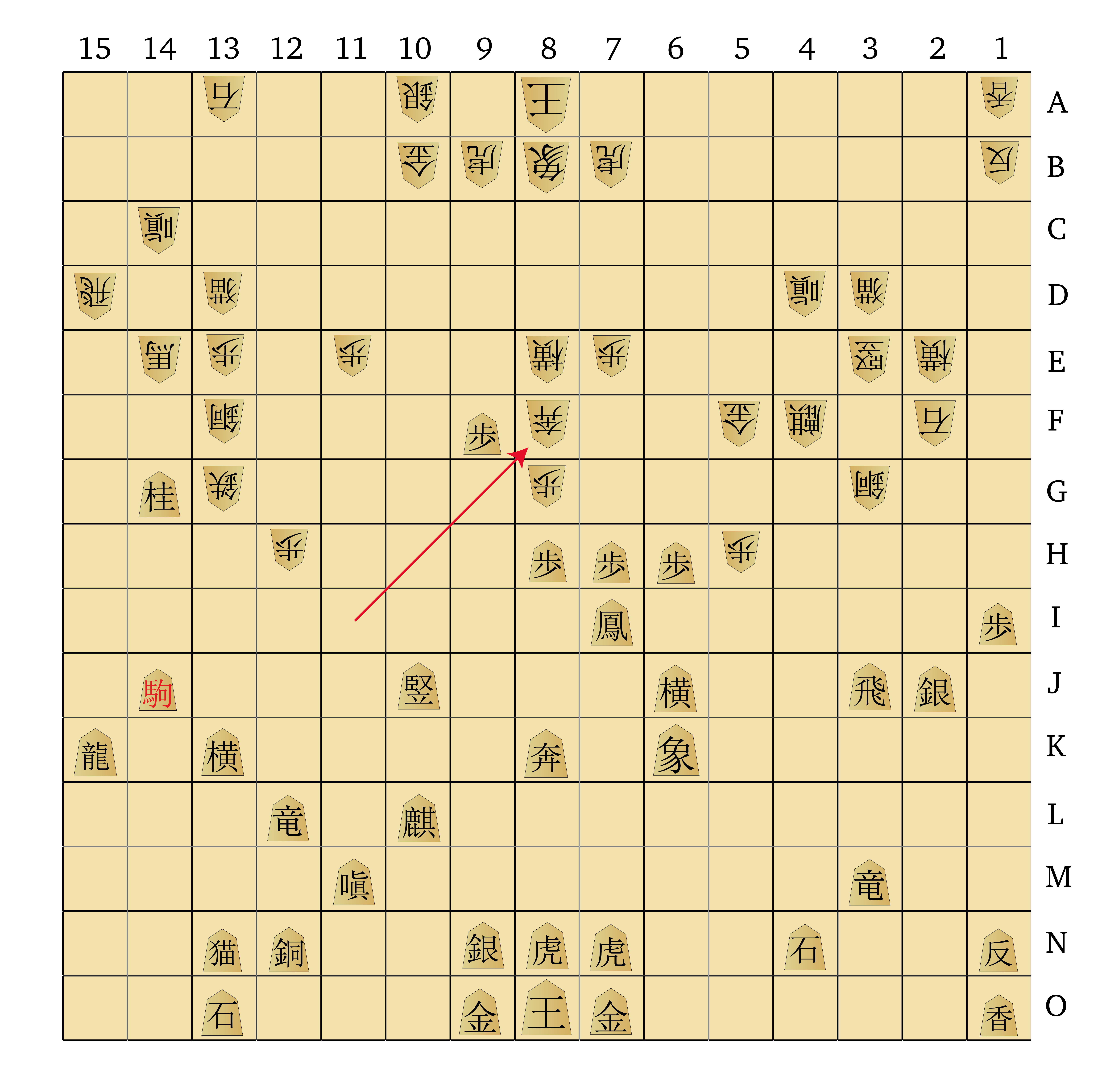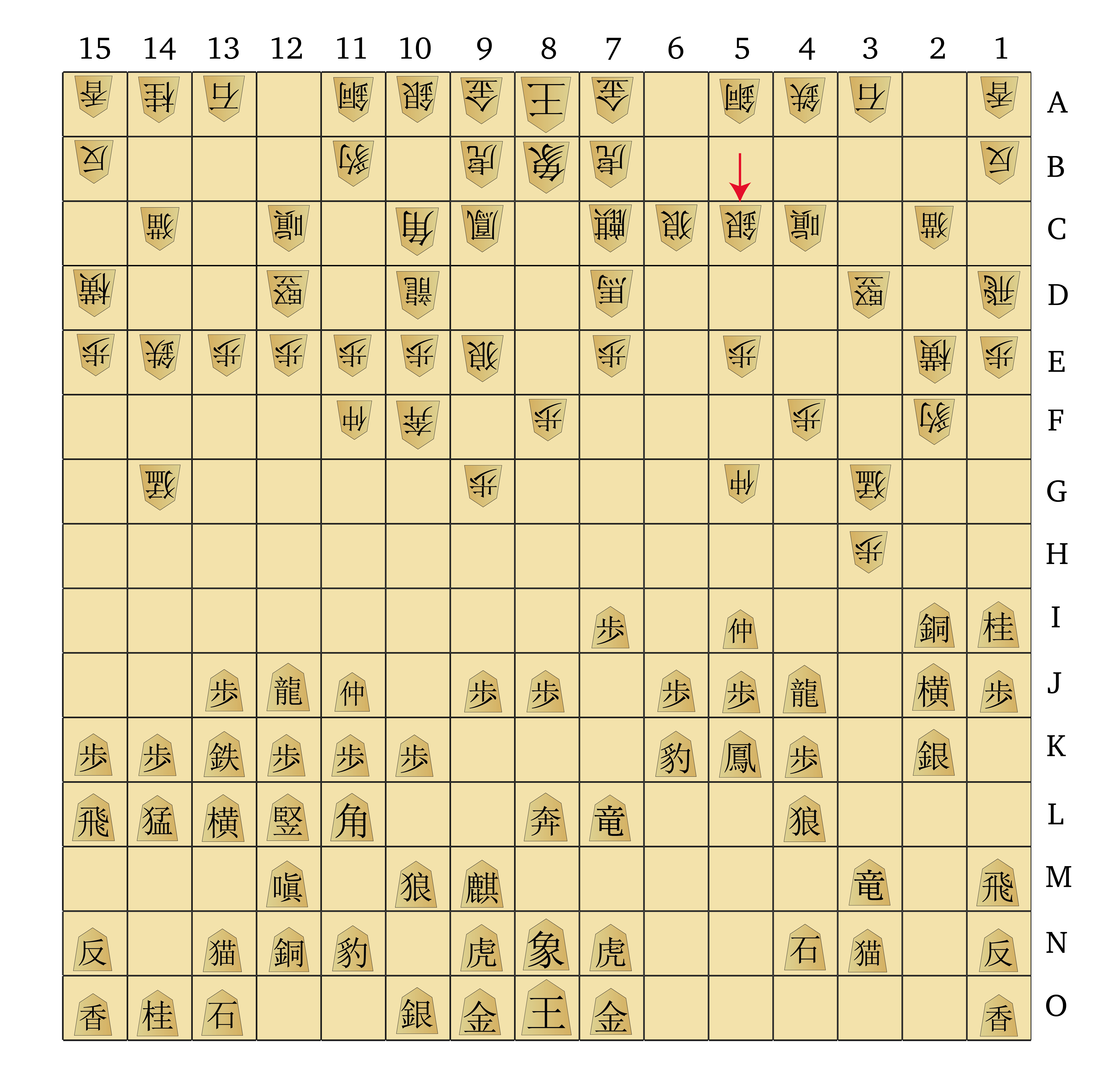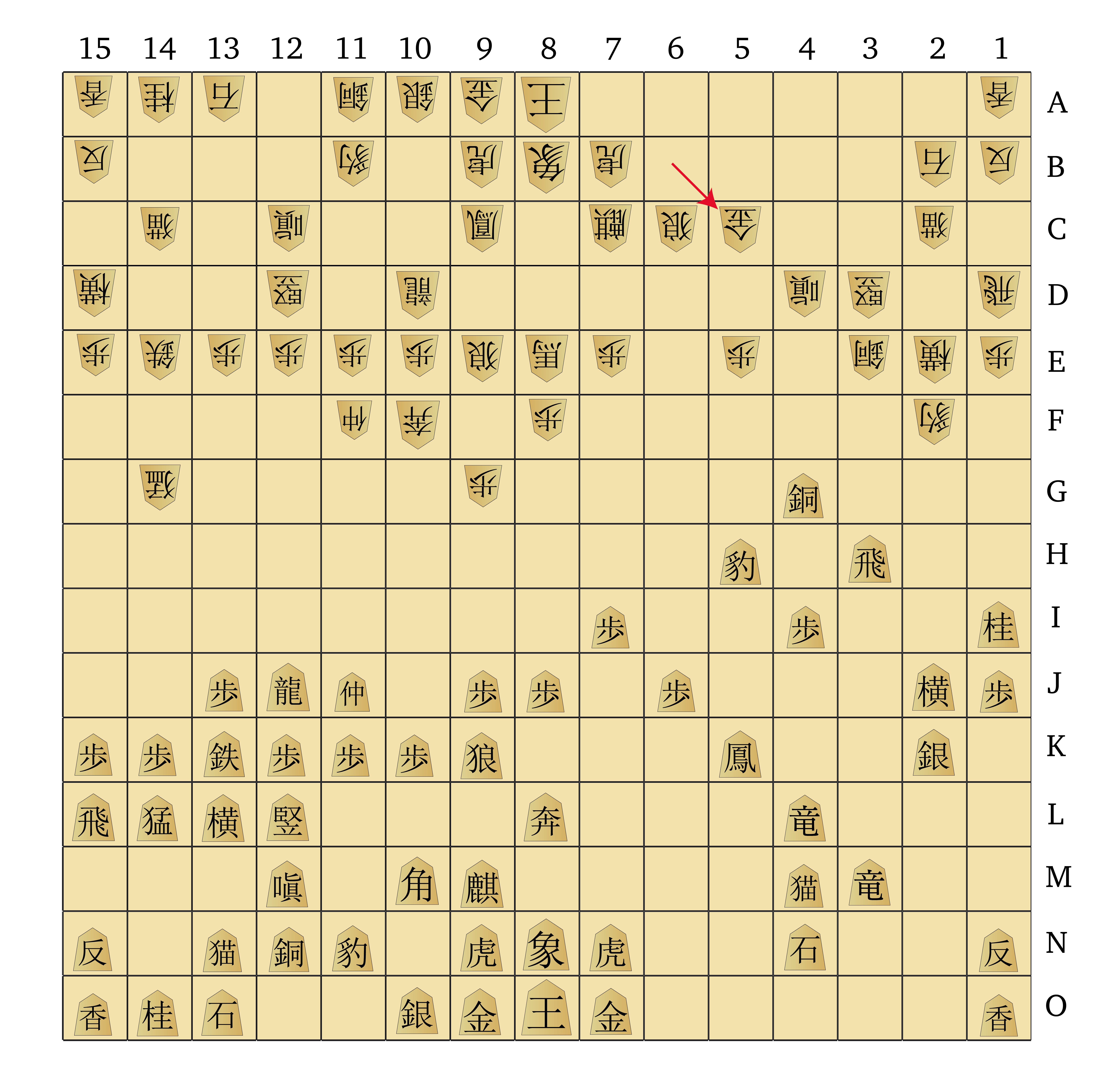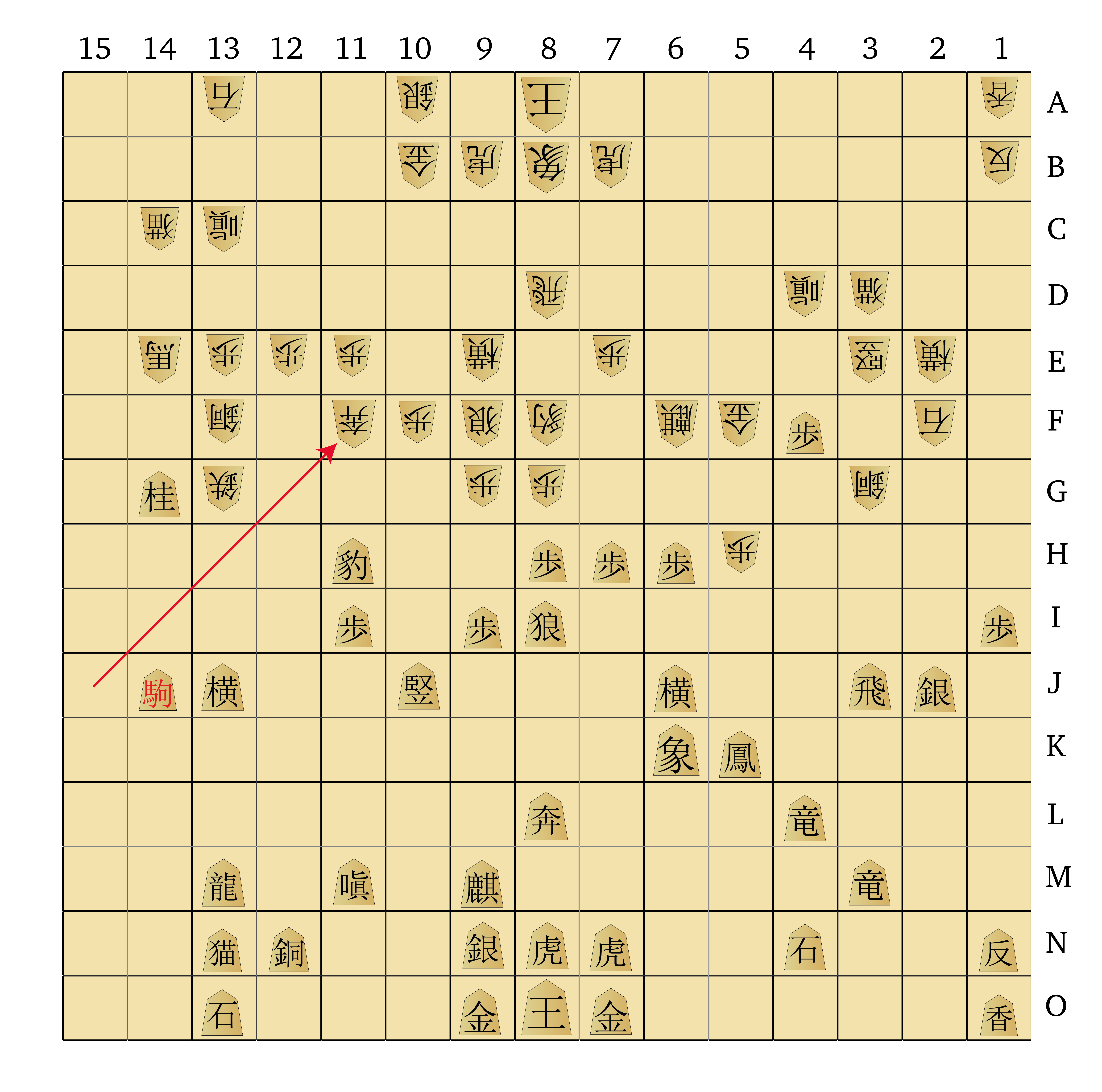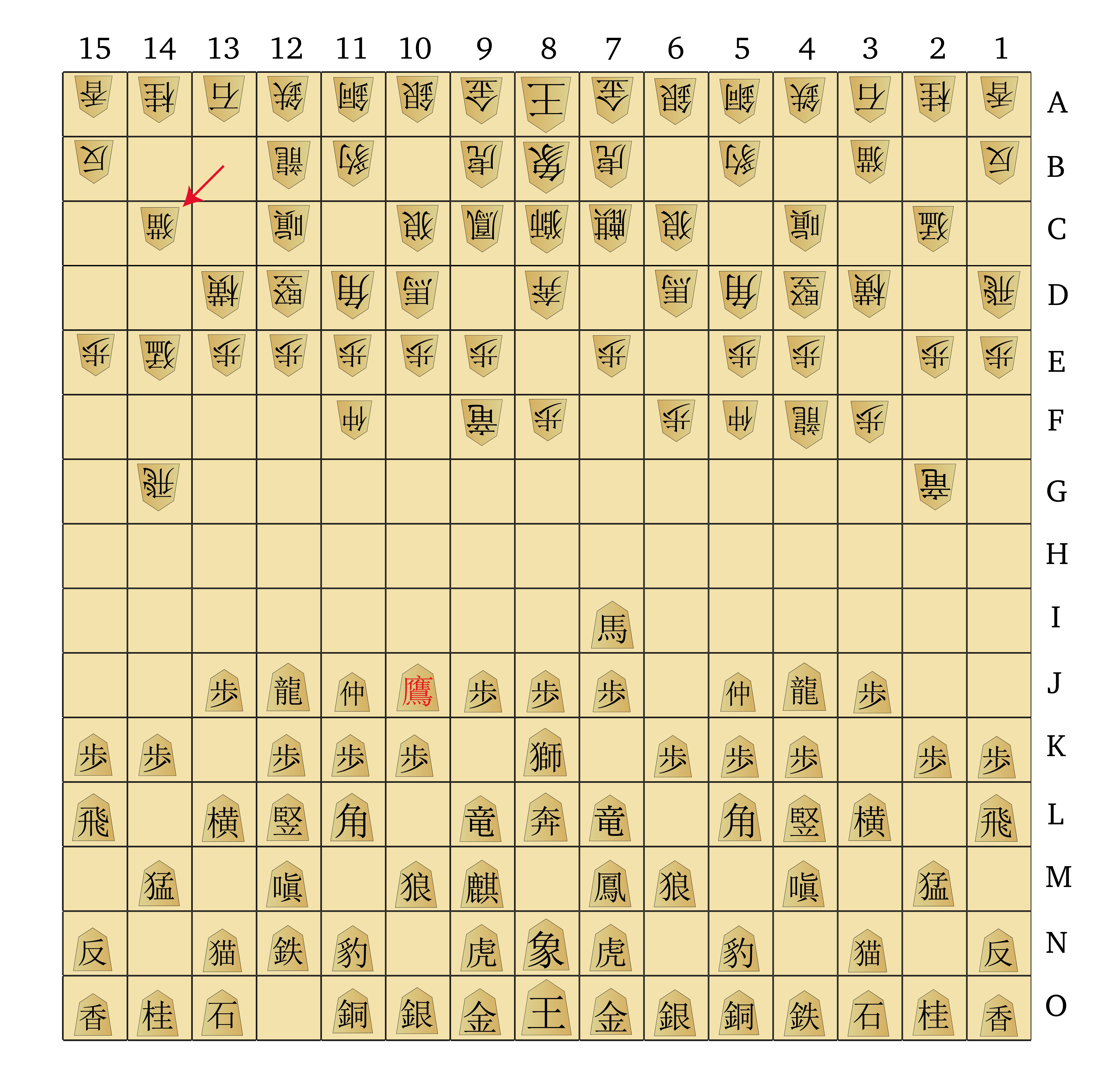 The result of all this is, I hope, a game that combines the dynamism of modern Shogi with the creative character of the ancient large Shogi variants. To give it a distinct personality I included pieces with unusual moves and abilities: