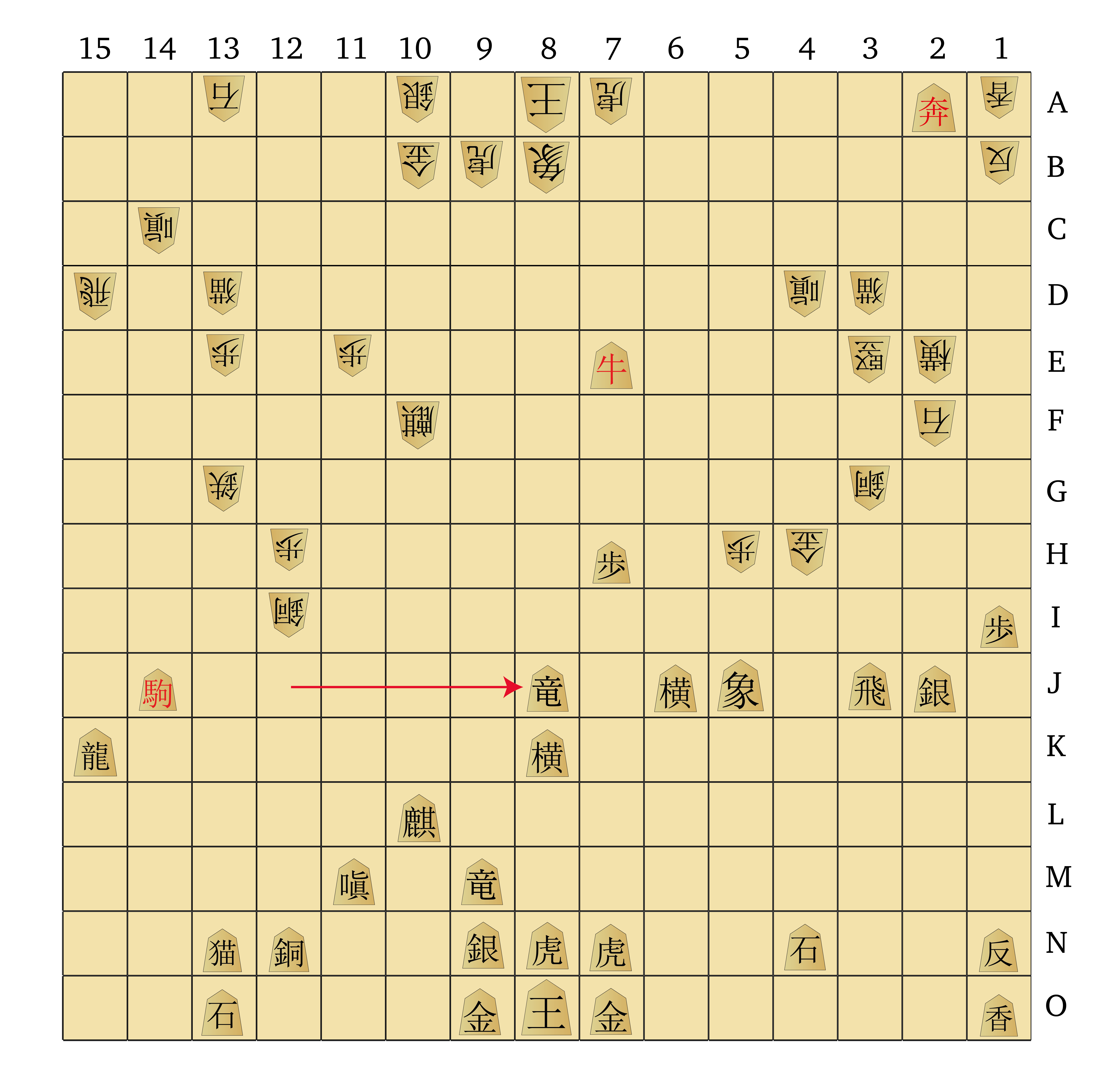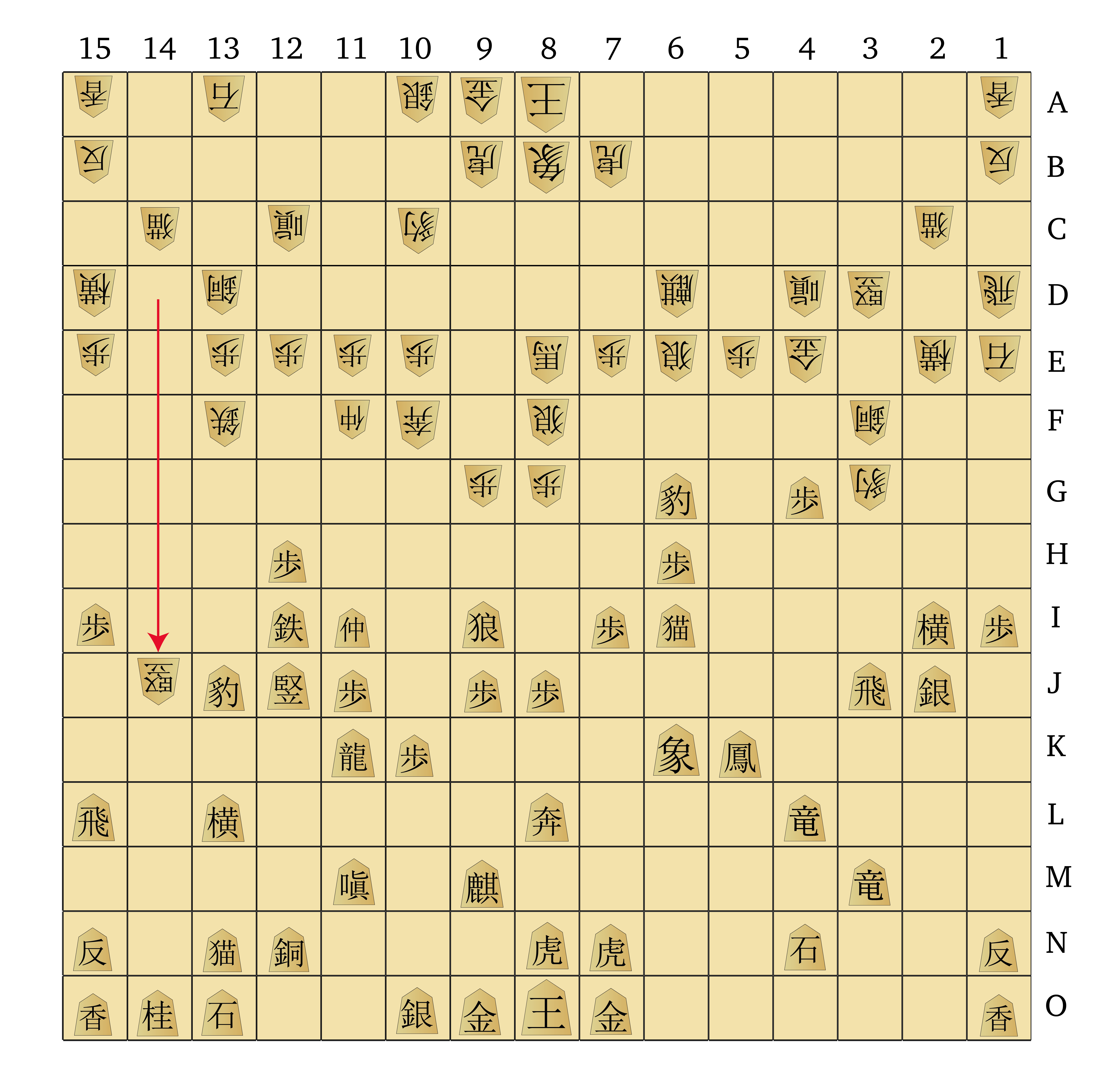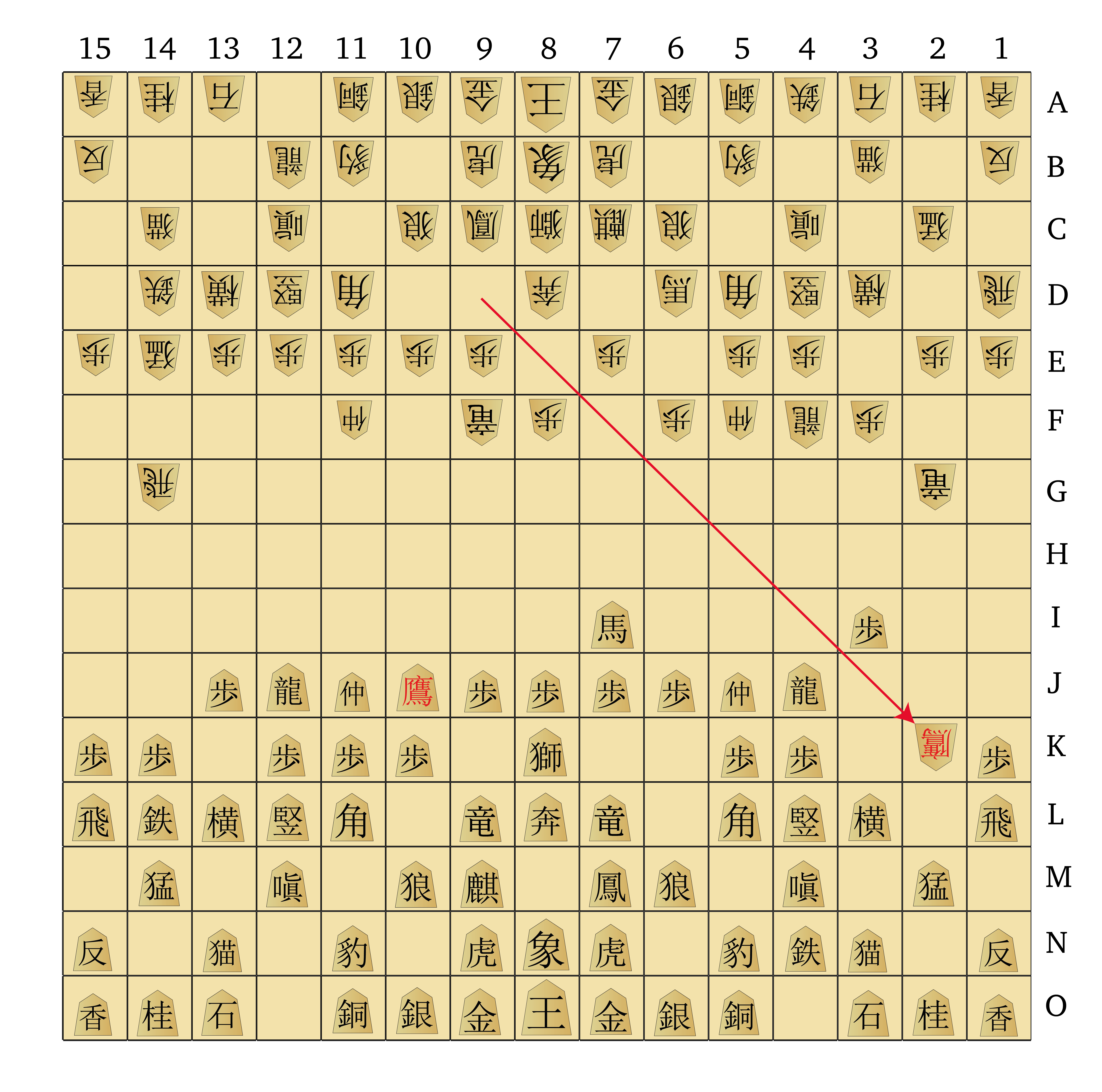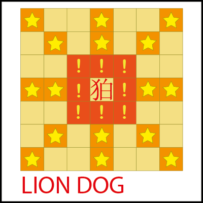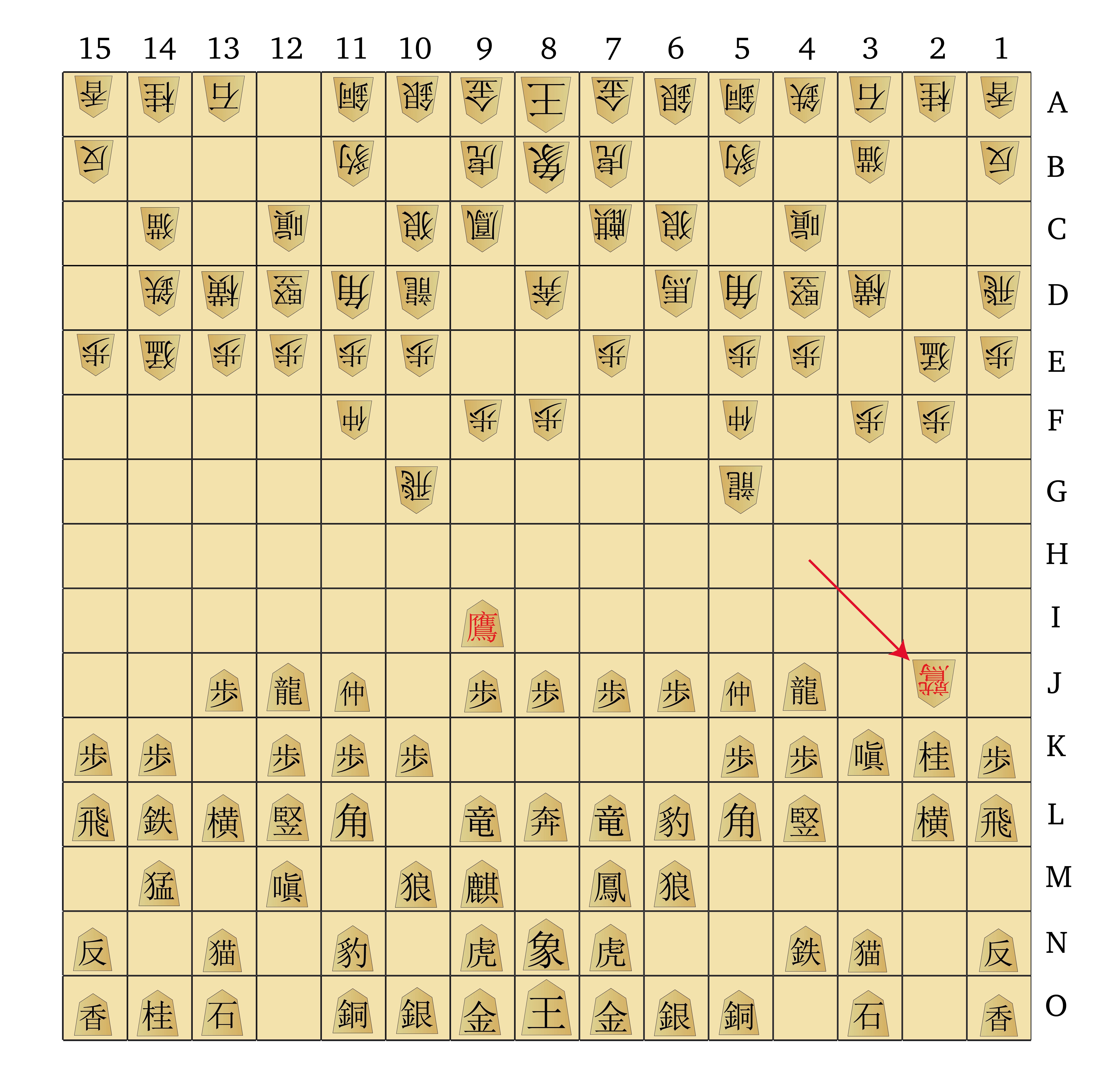 While working on Shinjuu I also constructed several other 11×11 modern Shogi variants, all of which incorporated pieces from Taikyoku Shogi. Each game focuses on a particular thematic category of pieces, like dragons, cats, and so on. I’ve been testing these in tandem with Shinjuu, and have found them to be fun introductions to the wild piece selection of the enormous Taikyoku Shogi. In the future I will feature these games as well, in particular Shouryu Shogi (Rising Dragon Shogi) and Puppy Shogi, which I believe to be the most promising games.