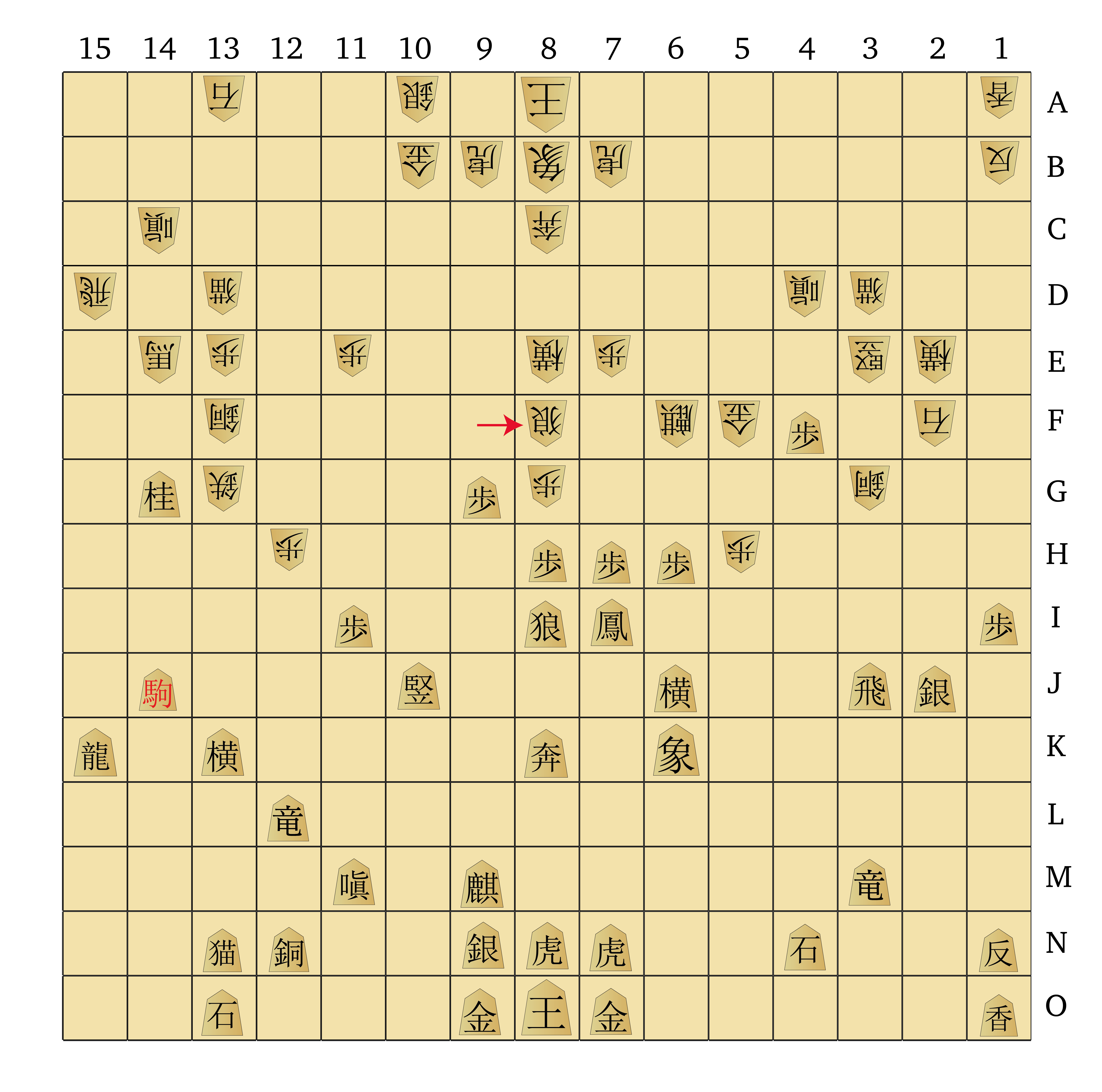 Here Sente has had its King forced into the centre, but it’s completely cocooned by a deep fortress of strong defenders. However, Gote drops a Phoenix and promotes to Wooden Dove, which puts the King in check via its 3-square leaping slide! This shows us the danger of having a dense fortress — the King can be forced out via leaping attacks, and in this case if the King hadn’t had this one escape square, this move would have been checkmate.