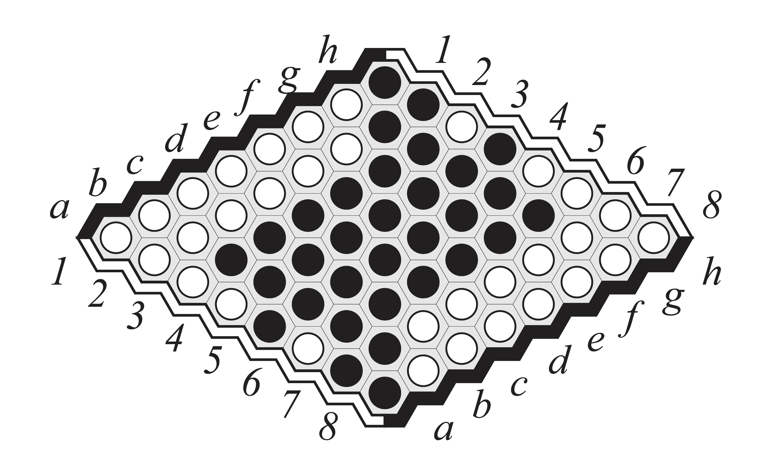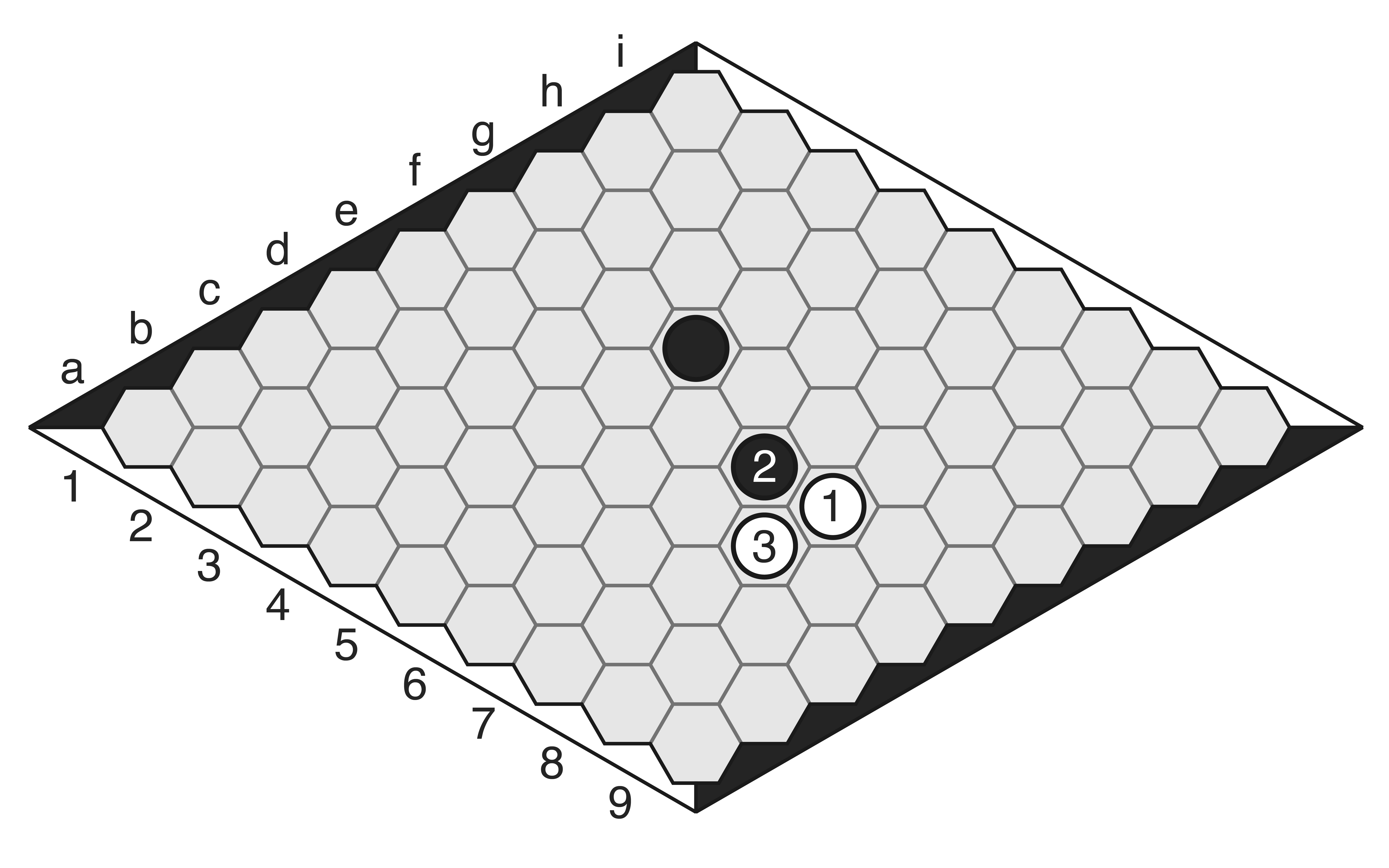 For a deeper, more strategic battle, I recommend playing on a 16×16 board. At this size, games will last between 40-50 moves per player, about the same length as a typical game of Chess. Opening play on this board size will tend to focus more around the corners and edges of the board, with the centre becoming more important once territories have been settled around the sides. If you want the territorial aspect of the game to really dominate, then you can play on a 20×20 or even 24×24 board; on 24×24 a game will last about as long as a game of 19×19 Go (generally somewhat shorter). Ai Ai supports Permute play on all these sizes.