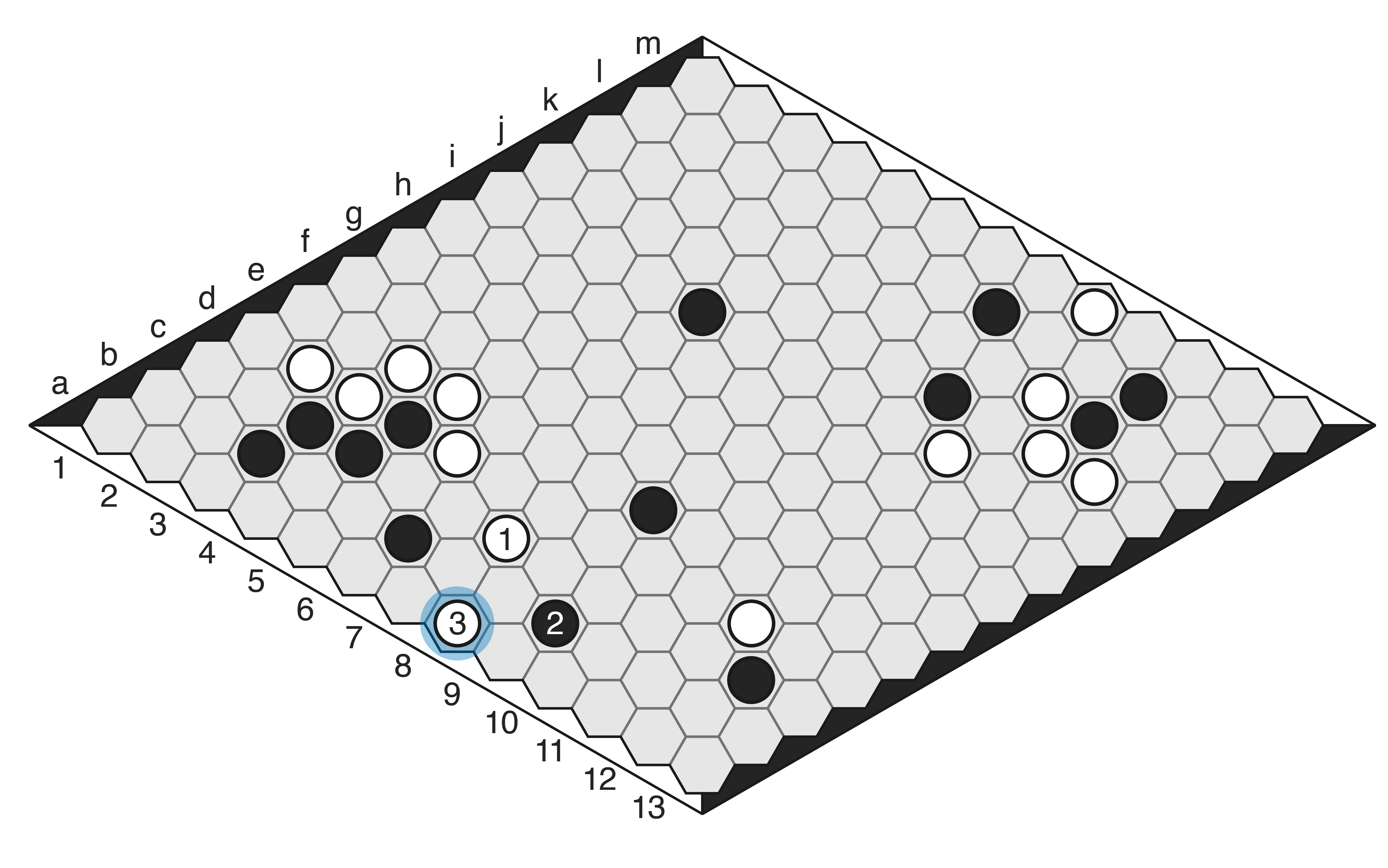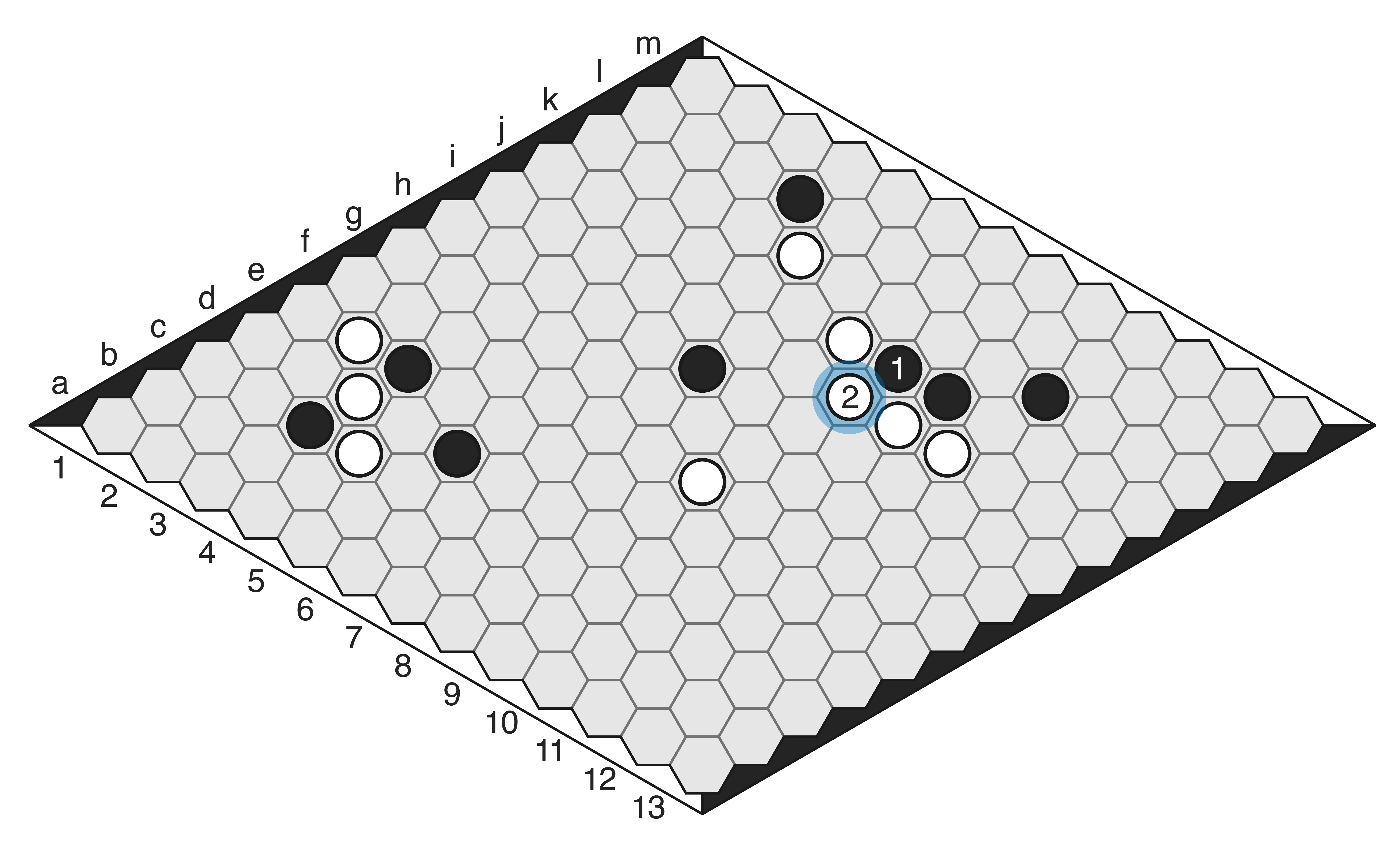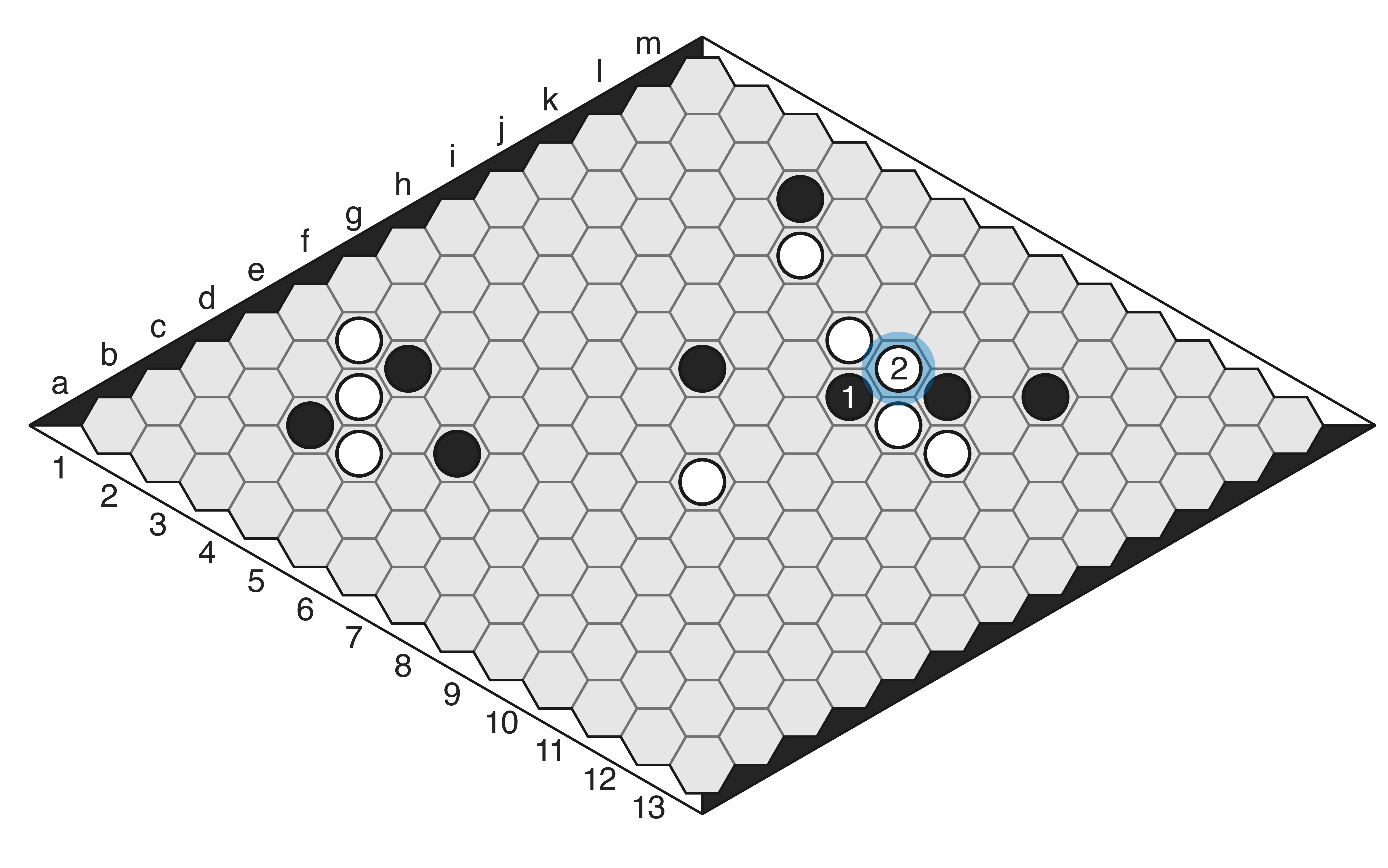 As you can see, the 12×12 game is intense right from the start, and opening moves are very consequential. AI testing shows though that between strong players, the outcome is usually decided about 60-70% through the game (during these tests I did not allow the AI to resign). So, while the opening is very important, most games will be decided during the middlegame. Our goal in the early stretches of a 12×12 game should be to come out of the opening with a stable central position, with some viable options for future extensions of our largest groups; during the middlegame we want to extend our groups effectively and safely, while denying opportunities for our opponent to attack our groups or build their own.
