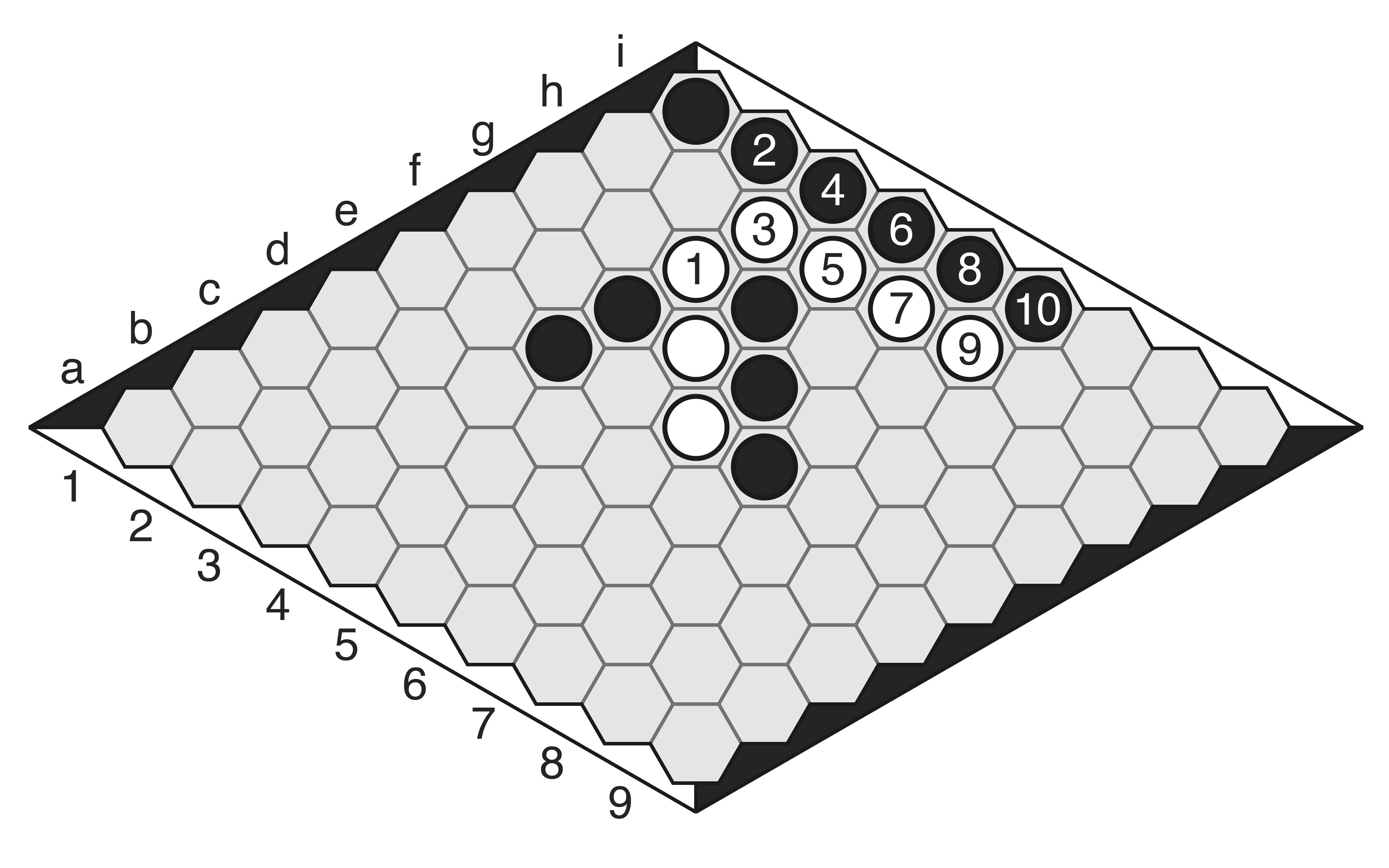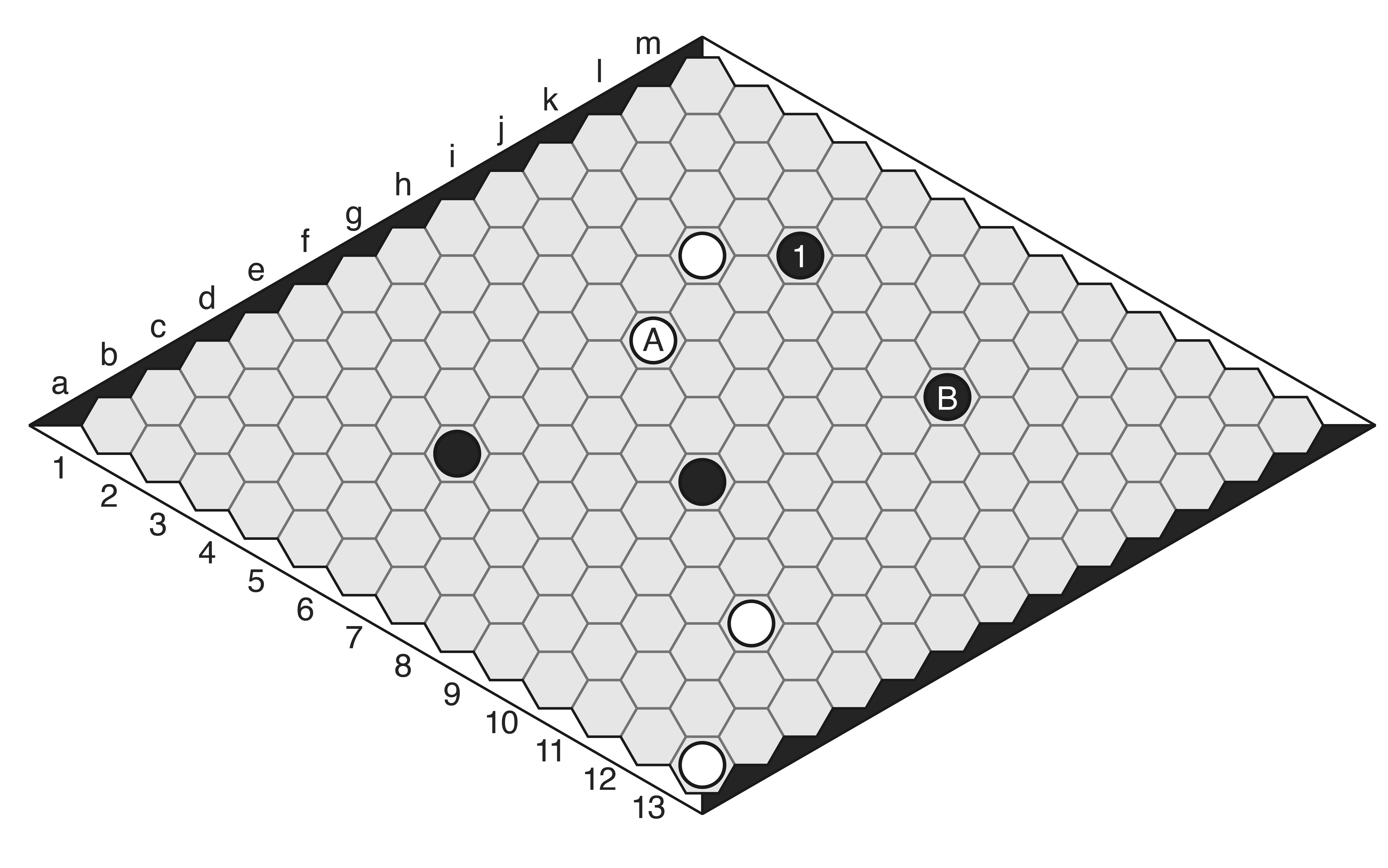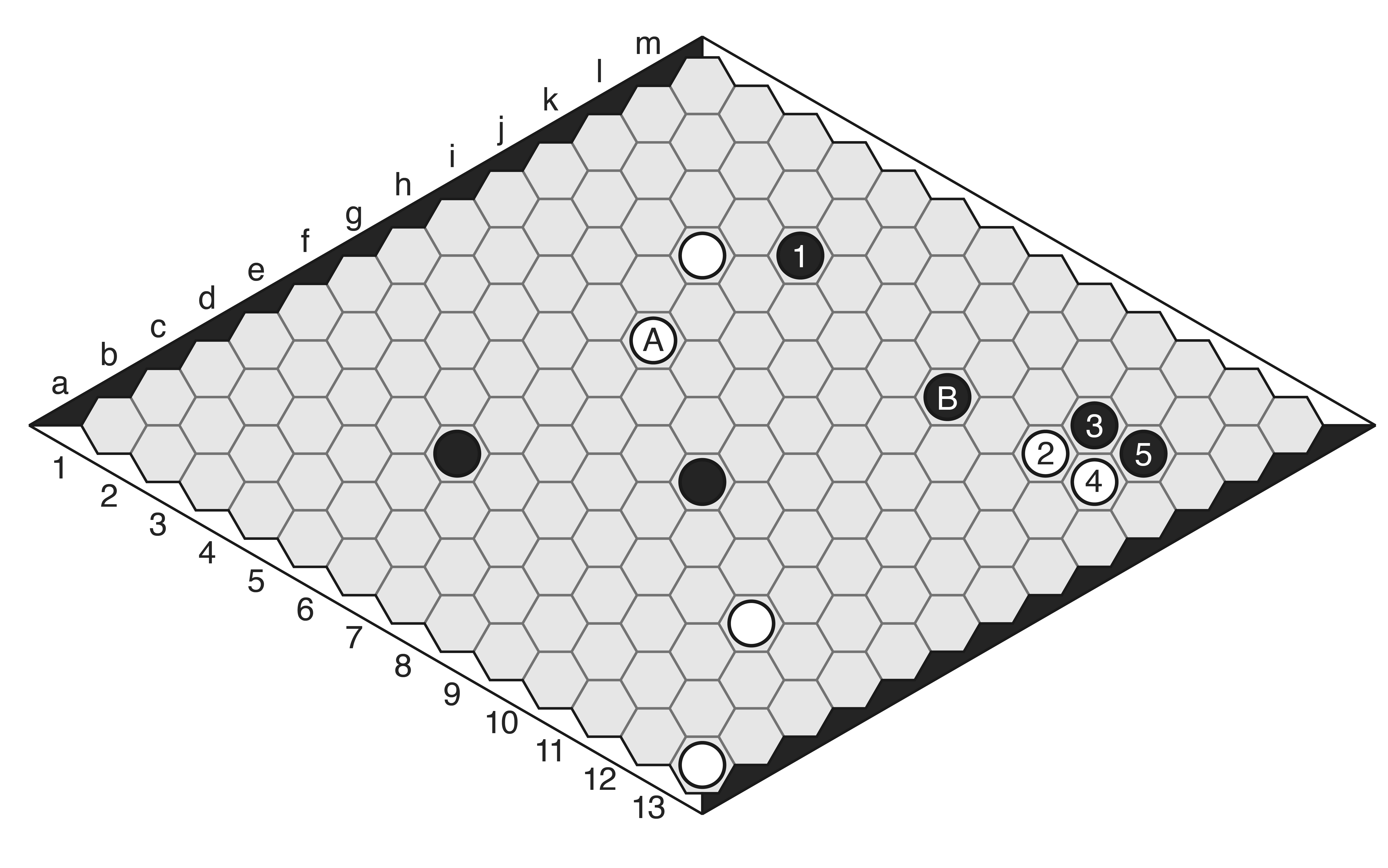 As you can see, the 12×12 game is intense right from the start, and opening moves are very consequential. AI testing shows though that between strong players, the outcome is usually decided about 60-70% through the game (during these tests I did not allow the AI to resign). So, while the opening is very important, most games will be decided during the middlegame. Our goal in the early stretches of a 12×12 game should be to come out of the opening with a stable central position, with some viable options for future extensions of our largest groups; during the middlegame we want to extend our groups effectively and safely, while denying opportunities for our opponent to attack our groups or build their own.